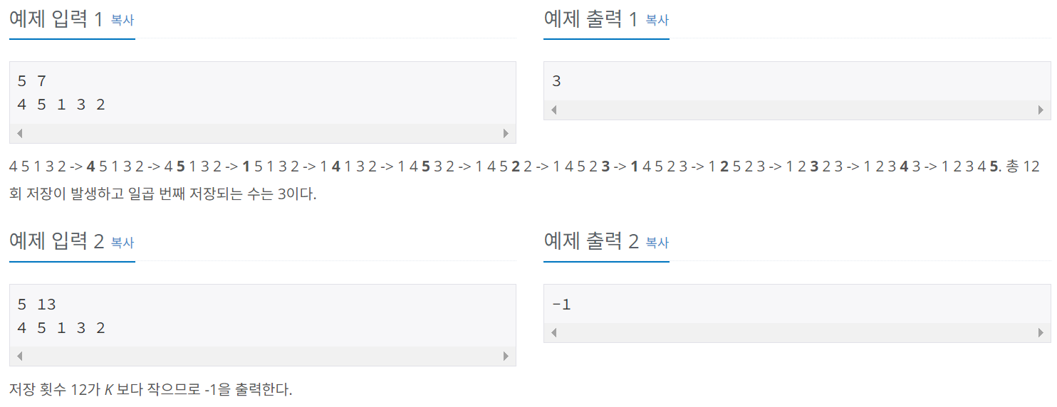 - 배열이 정렬된 후, 저장되는 수에 저장된 원소 개수가 입력받은 저장 횟수보다 크거나 같으면 if (K <= len(result))