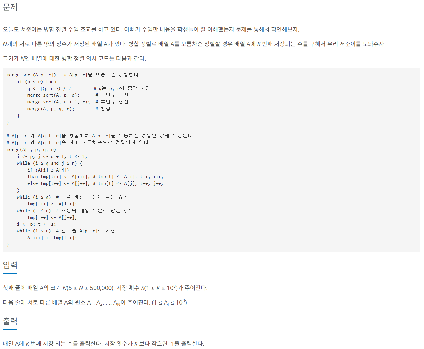 24060번: 알고리즘 수업 - 병합 정렬 1