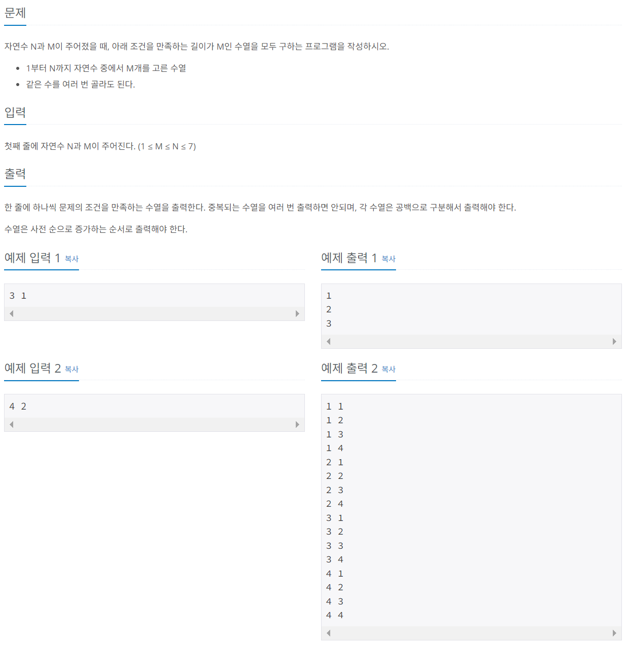 15651번: N과 M (3)