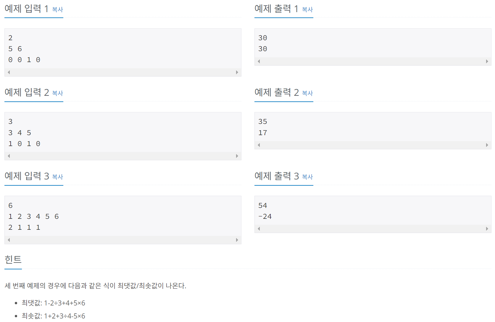 해당 문제는 연산자를 각 수 사이에 넣는 순서에 따라 달라지는 연산의 결과 중 최댓값과 최솟값을 구하는 문제이다.