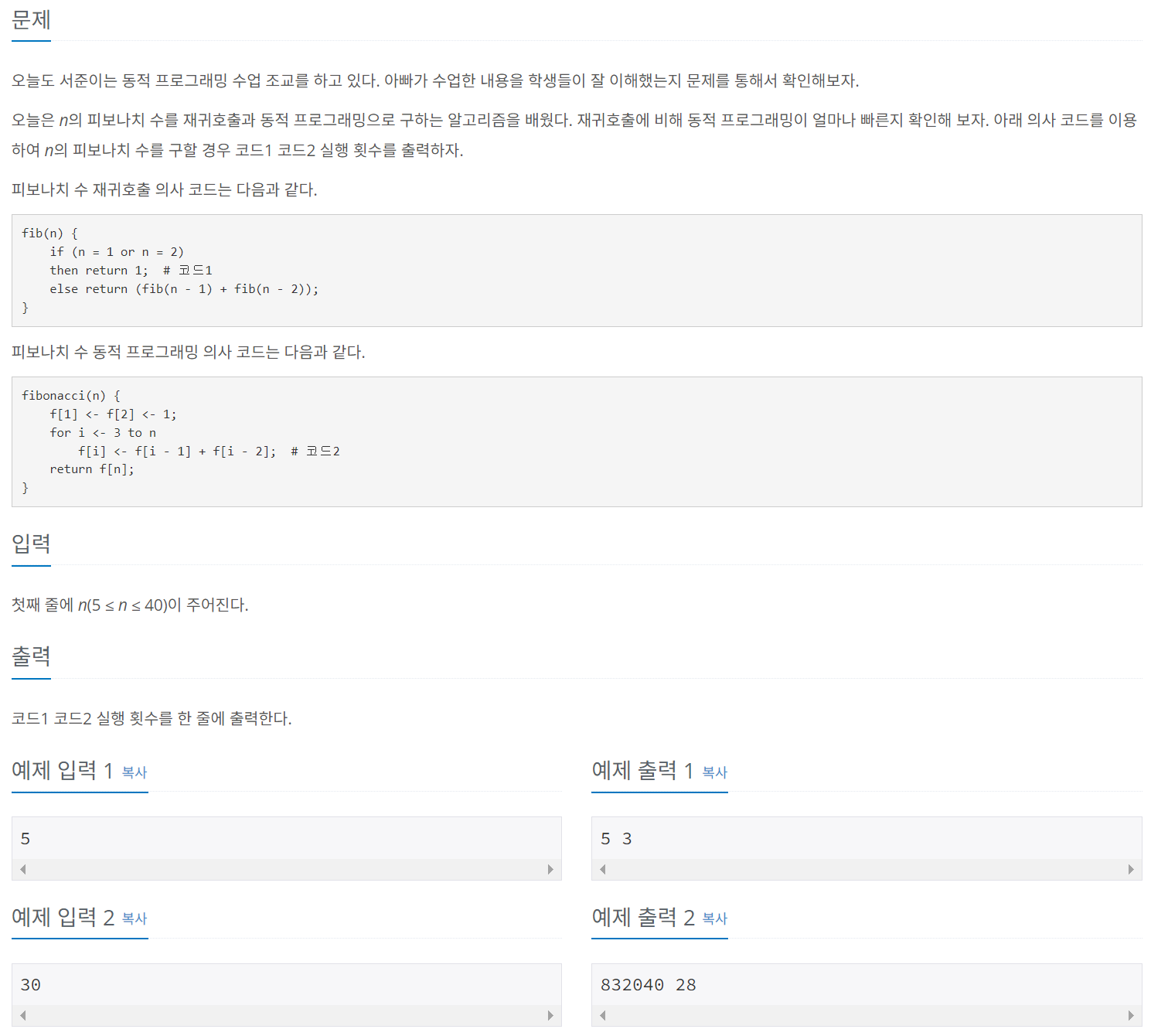 오늘도 서준이는 동적 프로그래밍 수업 조교를 하고 있다. 아빠가 수업한 내용을 학생들이 잘 이해했는지 문제를 통해서 확인해보자. 오늘은 n의 피보나치 수를 재귀호출과 동적 프로그래밍