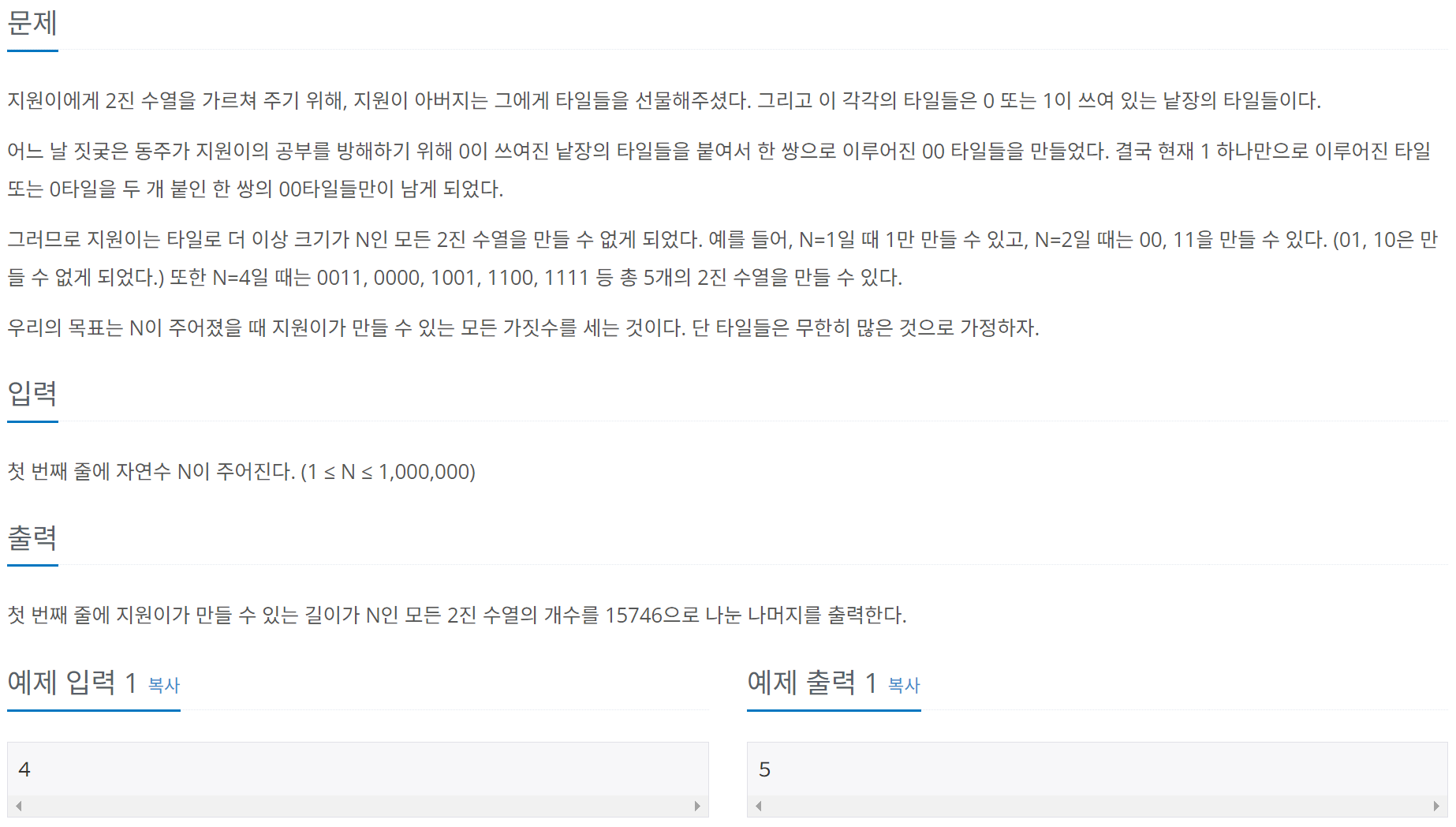 - 해당 결과는 이전 2개의 결과를 더해 15746으로 나눈 값을 저장한다. dp[i] = (dp[i - 1] + dp[i - 2]) % 15746