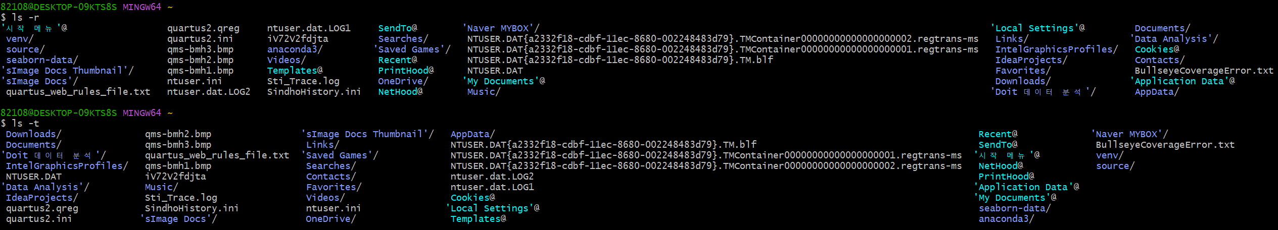 ls -t : 파일 작성 시간순으로 (내림차순) 표시