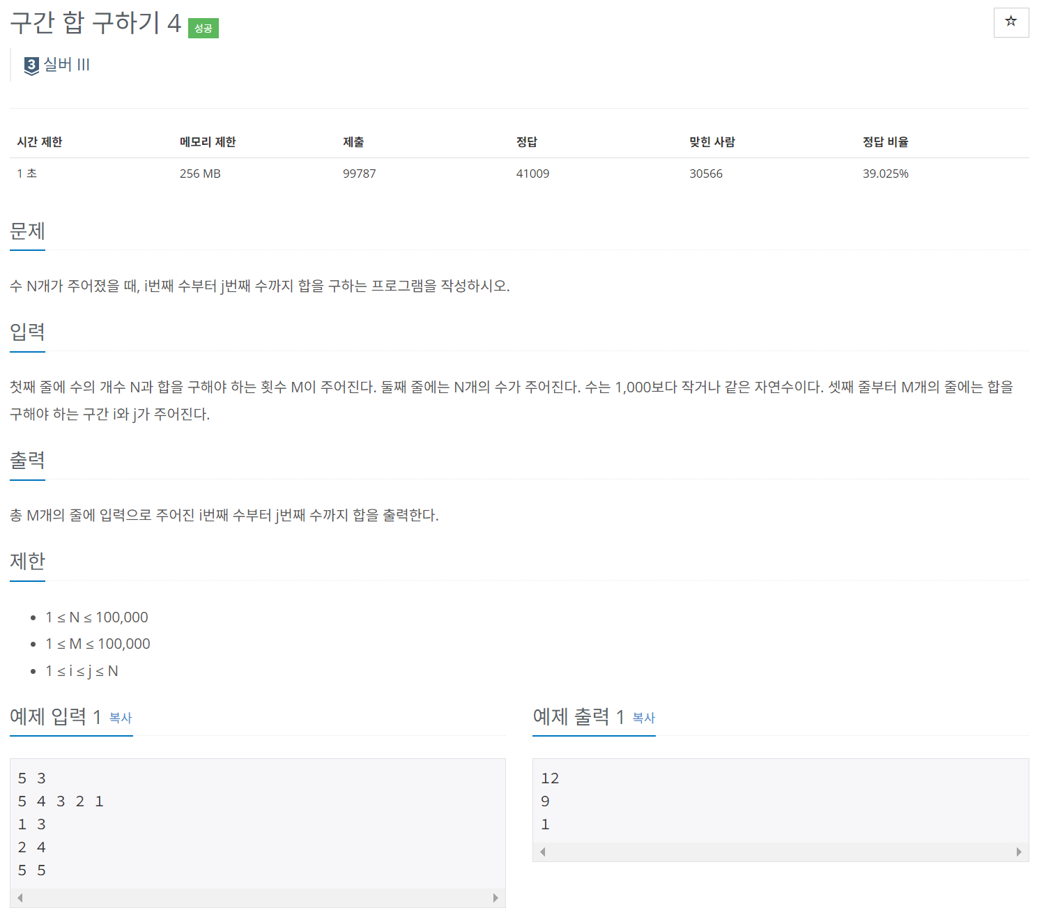 첫째 줄에 수의 개수 N과 합을 구해야 하는 횟수 M이 주어진다. 둘째 줄에는 N개의 수가 주어진다. 수는 1,000보다 작거나 같은 자연수이다. 셋째 줄부터 M개의 줄에는 합을 구해야 하는 구간 i와 j