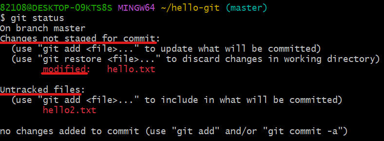 이후 git status 명령으로 깃의 상태를 보면 hello.txt 파일은 변경된 파일이 아직 스테이지에 올라가지 않은 상태로 나타나고, hello2.txt 파일은 untracked files로 한 번도 커밋하지 않은 파일이라 수정 내역을 추적하지 않는다.
