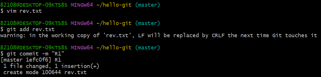 rev.txt 파일을 만들어 a를 적고 rev.txt 파일을 스테이지에 올린 후, 커밋 메시지 R1을 붙여 커밋한다.