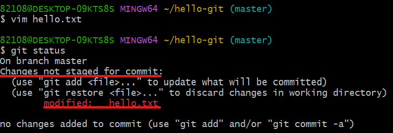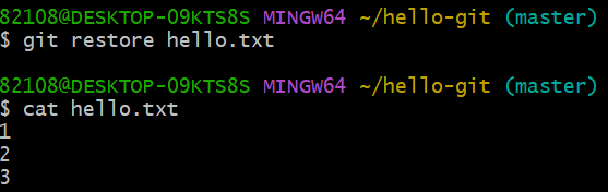 하여 git restore 명령을 사용해 hello.txt 파일의 수정 사항을 취소하고 해당 파일을 확인하면 파일이 수정하기 전 상태로 남아있는 것을 확인할 수 있다.