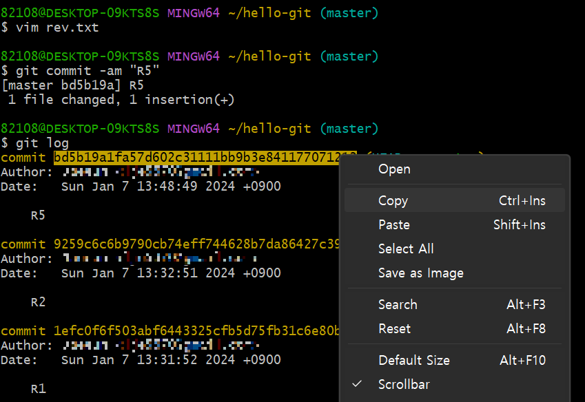 되돌릴 커밋의 커밋 해시를 선택해 마우스 오른쪽 버튼을 눌러 Copy 한다.