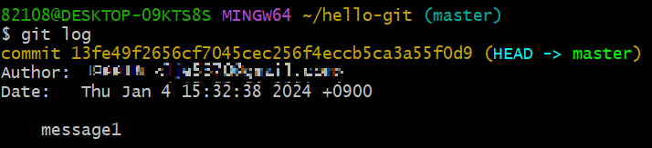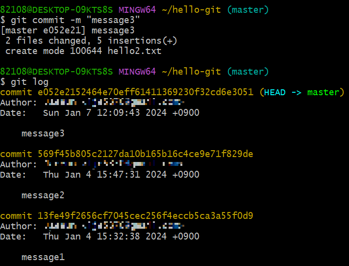 git commit 명령으로 커밋을 하고 git log 명령으로 커밋 로그를 확인해 보면 message3라는 메시지를 붙인 커밋을 볼 수 있다.