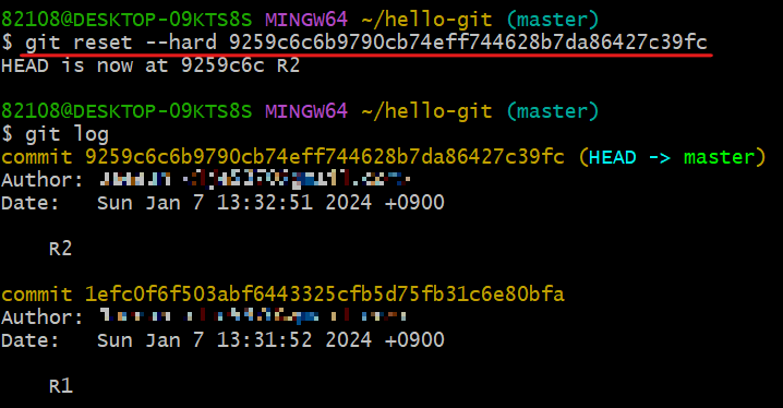 git reset --hard 명령 뒤에 복사한 커밋 해시를 붙여 넣고 실행하면 복사해서 붙인 커밋 해시 위치로 HEAD가 옮겨졌다고 나타난다.