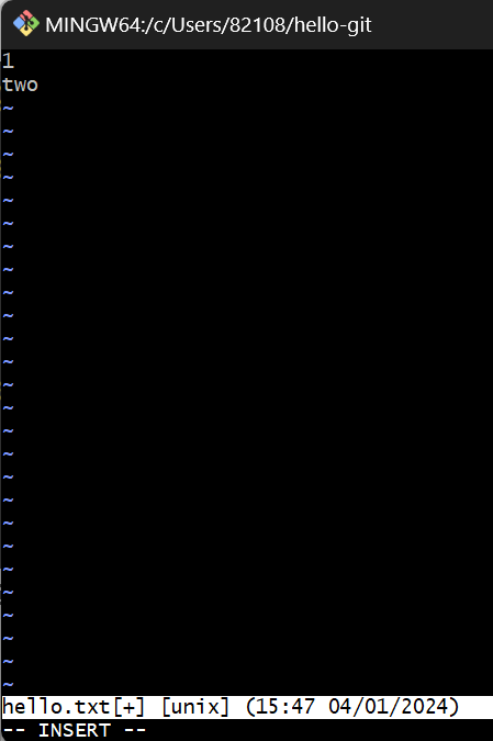 vim hello.txt 명령으로 파일을 만들어 빔 편집기를 열고 I or A를 눌러 입력모드로 바꾼다.