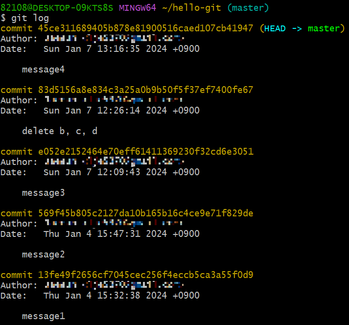 이후 git log 명령으로 커밋을 확인해 보면 message4 커밋이 사라진 것을 확인할 수 있다.