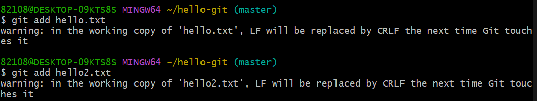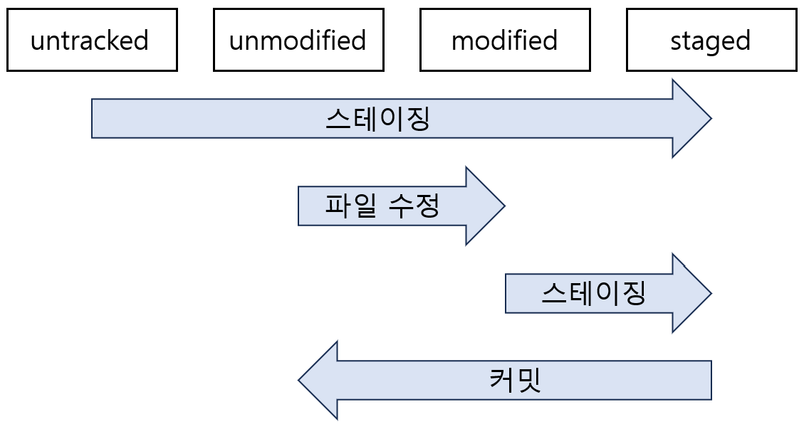 hello.txt 파일처럼 한 번 커밋되어 깃이 수정 사항이 있는지 추적하고 있는 파일을 tracked 파일이라고 하고, hello2.txt 파일처럼 한 번도 커밋하지 않아서 수정 내역을 추적하지 않는 파일을 untracked 파일이라고 한다.