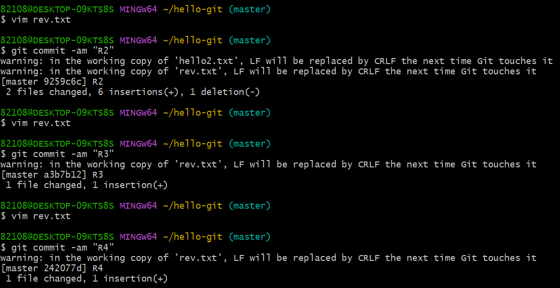 rev.txt 파일에 b를 추가해 커밋 메시지 R2를 붙여 커밋하고, c를 추가해 커밋 메시지 R3를 붙여 커밋하고, d를 추가해 커밋 메시지 R4를 붙여 커밋한다.