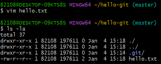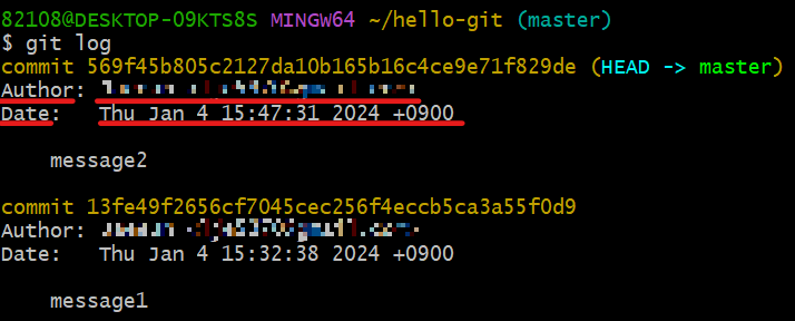 이후 git log 명령으로 저장소에 저장된 버전을 확인하면 hello.txt의 버전이 2개가 나타나는데, 가장 최근 버전 정보가 맨 위에 보이는 것을 확인할 수 있다.