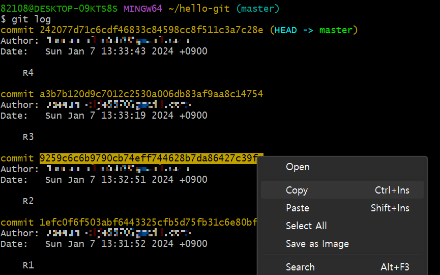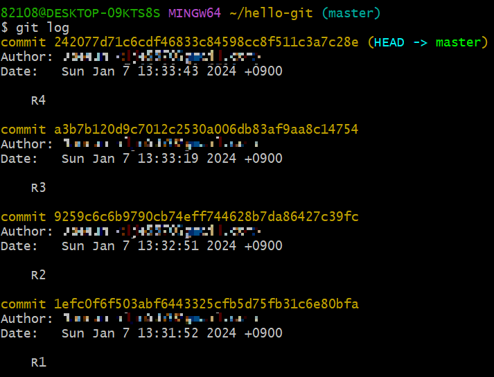 git log 명령으로 로그 목록을 확인해 보면 R4 커밋과 R3 커밋이 삭제되고 커밋 해시를 복사한 R2 커밋이 최신 커밋이 된 것을 확인할 수 있다.