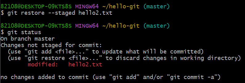 git restore -stage 명령으로 스테이지에 있는 hello2.txt 파일을 내린다.