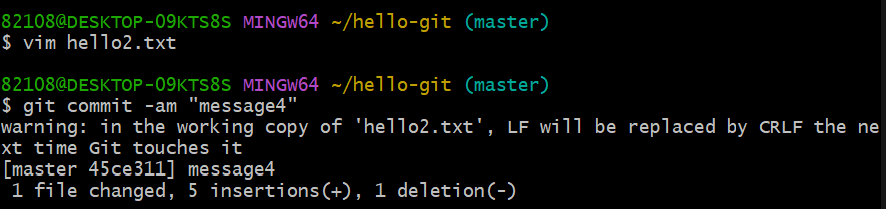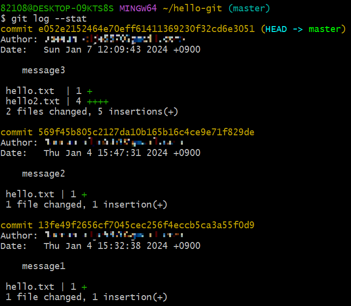 message3는 hello.txt 파일에서 수정 내용 1개, hello2.txt 파일에서 수정 내용 4개 추가된 것을 볼 수 있다.