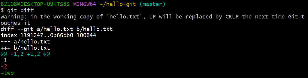 git diff : 작업 트리에 있는 파일과 스테이지에 있는 파일을 비교하거나, 스테이지에 있는 파일과 저장소에 있는 최신 커밋을 비교해 수정한 파일을 커밋하기 전에 최종 검토할 수 있는 명령git diff 명령으로 방금 수정한 파일이 저장소에 있는 최신 버전의 파일과 어떻게 다른지 확인해 보면, 2가 삭제되었고(-2) two가 추가되었다는 것(+two)을 알 수 있다.