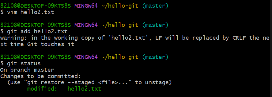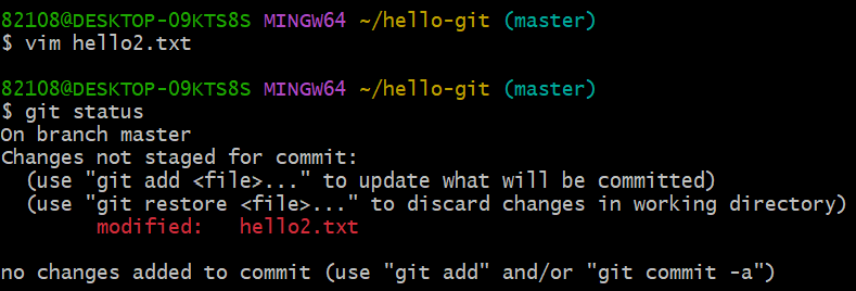 hello2.txt 파일을 수정하고 git status 명령으로 깃의 상태를 확인해 보면, hello2.txt 파일이 수정되었고 아직 스테이지에 올라가지 않은 파일이 수정만 된 modified 상태가 된다.