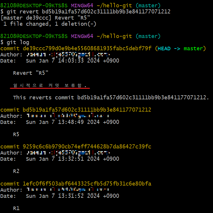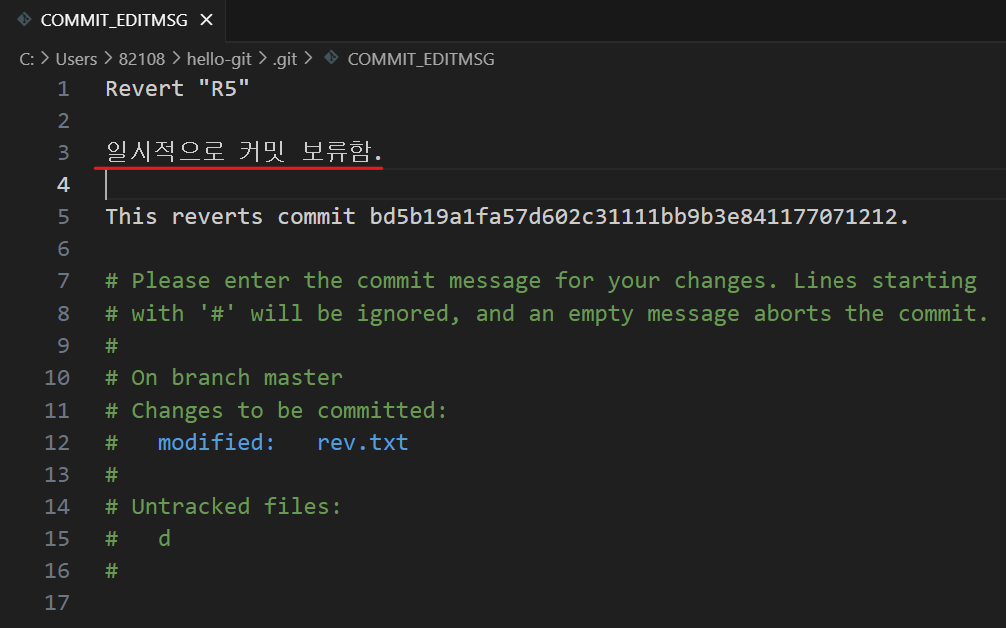 이후, git revert 명령 뒤에 복사한 커밋 해시를 붙여 실행하면 기본 편집기가 자동으로 나타나는데, 편집기에 해당 커밋 메시지를 입력하고 저장하면(닫으면) R5 버전이 revert 되었다는 메시지가 나온다.