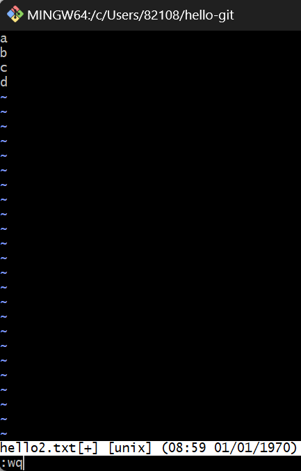 vim hello.txt 명령으로 빔 편집기에 hello.txt 파일을 열어 2를 추가한 후, 저장하고 편집기를 종료한다.