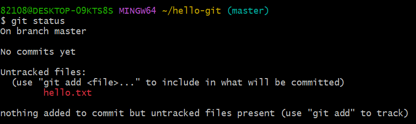 그리고 hello.txt 파일 앞에 new file 수식어가 나오는데, 이것은 새 파일 hello.txt를 커밋할 것이라는 의미이다.
