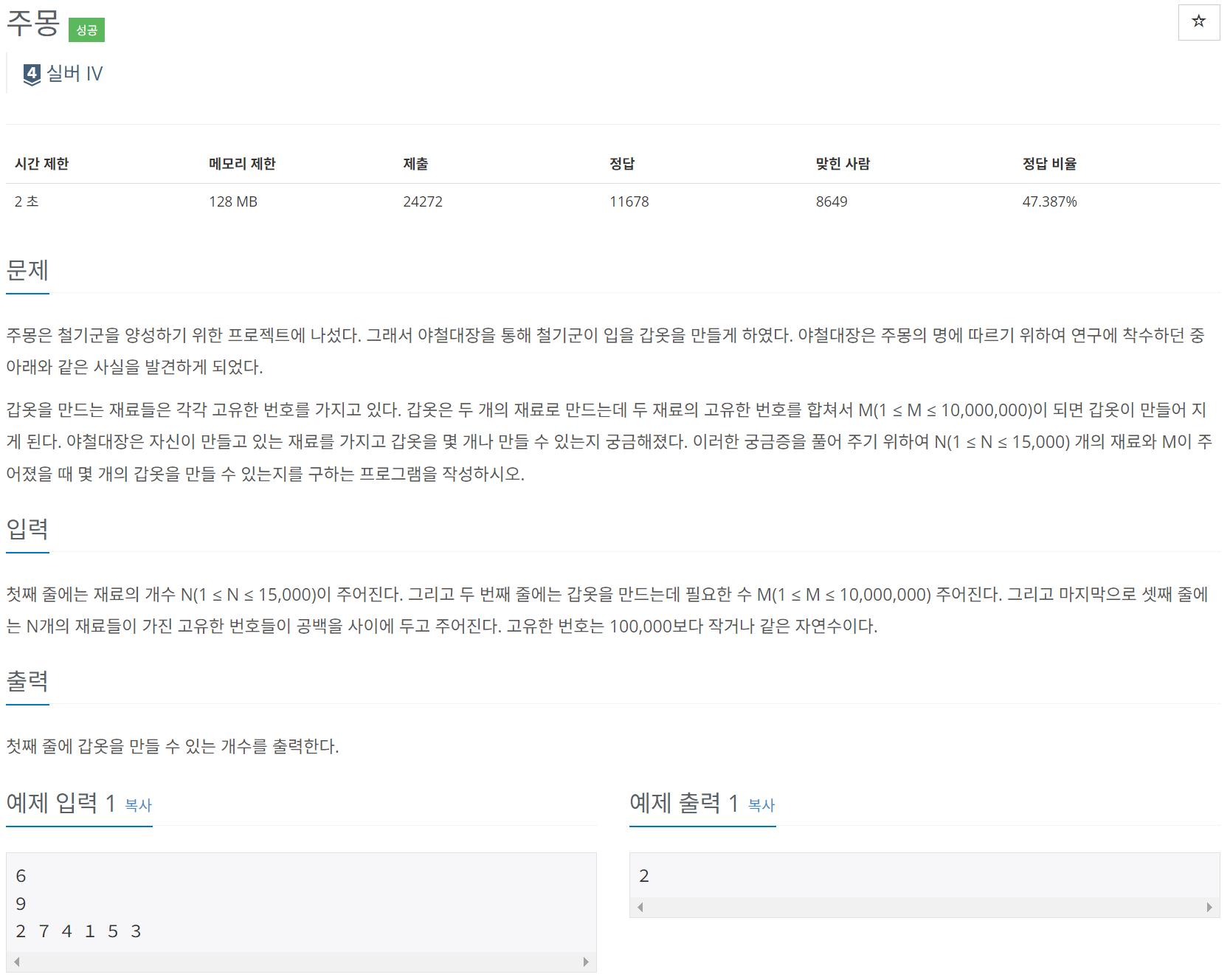 만약 두 포인터의 위치 번호의 합이 갑옷을 만드는데 필요한 수와 동일하다면 갑옷을 만들 수 있는 경우다.