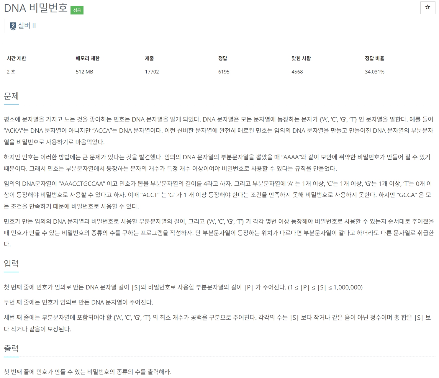 평소에 문자열을 가지고 노는 것을 좋아하는 민호는 DNA 문자열을 알게 되었다. DNA 문자열은 모든 문자열에 등장하는 문자가 {‘A’, ‘C’, ‘G’, ‘T’} 인 문자열을 말한다. 예를 들어 “ACKA”