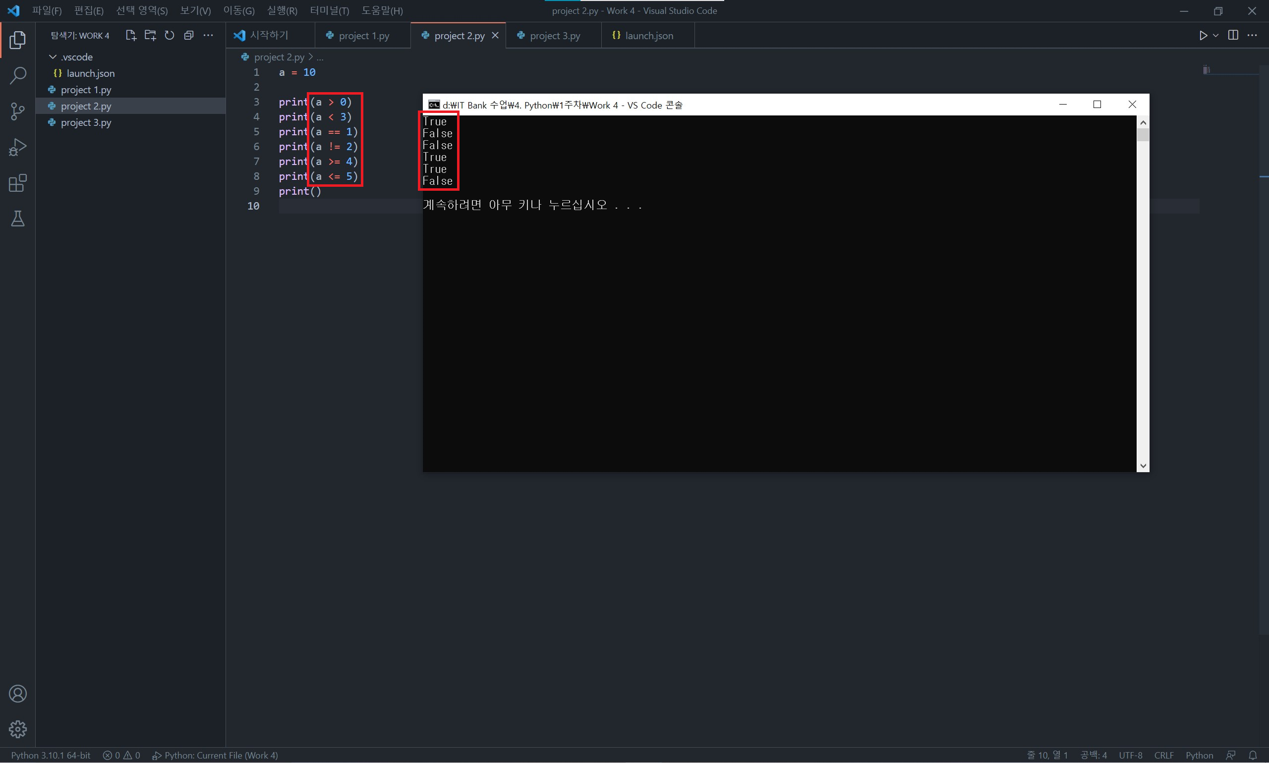 비교 연산자에는 >, <, ==, !=, <=, >= 가 존재합니다.