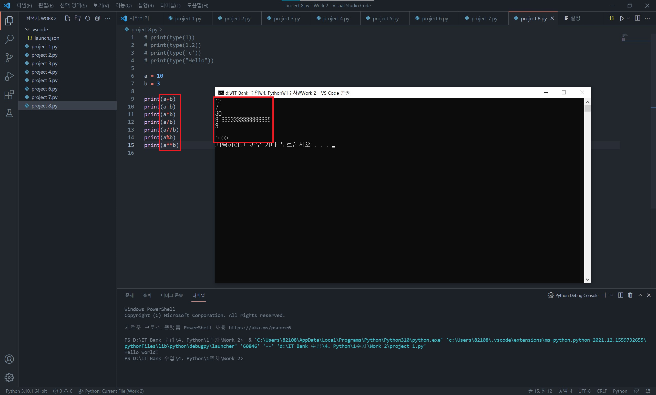 다만 산술 연산에서 + (뎃셈), - (뺄셈), * (곱셈), / (나눗셈), % (나머지 연산) 은 동일하지만 // (나눗셈의 몫 연산), ** (제곱) 등의 연산자가 추가로 더 있습니다. // (나눗셈의 몫 연산) 연산자가 존재하기 때문에 기본 / (나눗셈) 연산의 결과는 무조건 실수의 값으로 나옵니다.