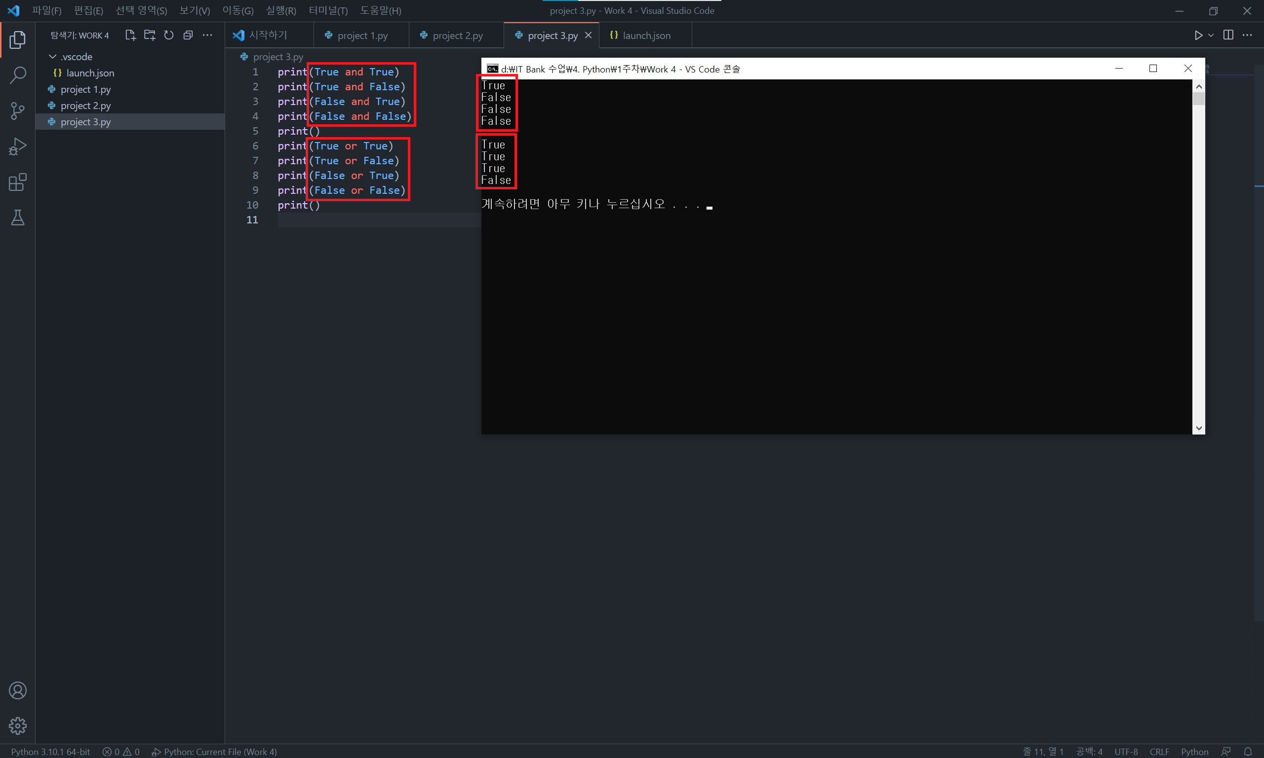 논리 연산자에는 and와 or이 있습니다. and 연산자는 모든 값이 True이어야만 결과가 True이고, or 연산자는 하나라도 True이면 결과가 True로 나오게 됩니다.