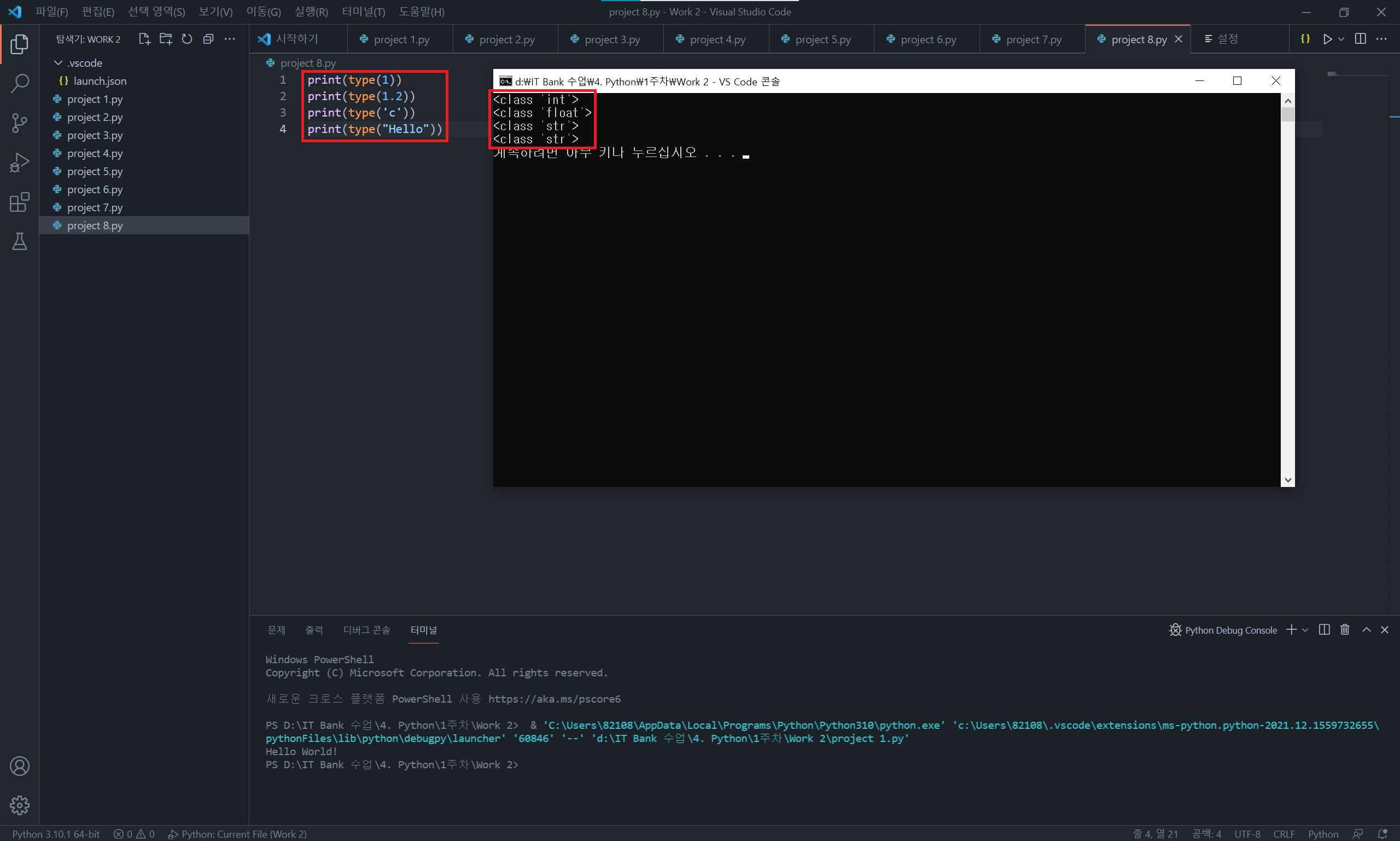 type(데이터) 형식으로 작성해 주고 출력하면 해당 데이터가 어떤 데이터 타입인지 알려줍니다.