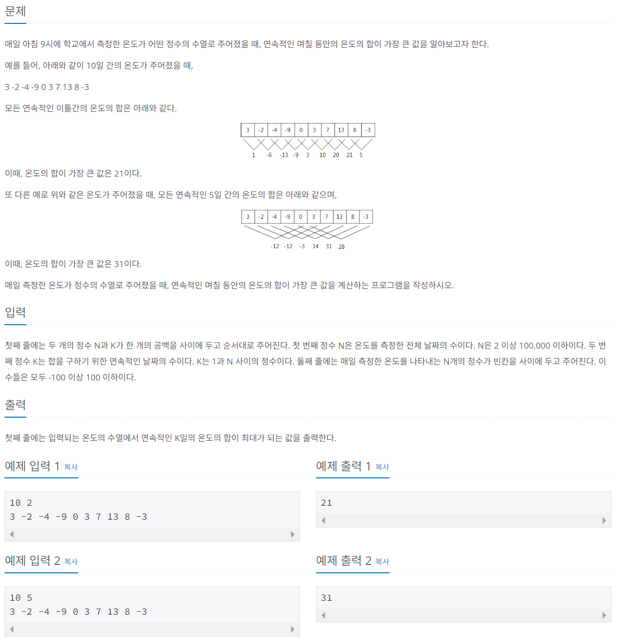 연속적인 날짜의 수가 따로 주어져 해당 날짜의 온도 합이 최대가 되는 값을 구해야 하는 문제이므로 매번 날짜의 온도 합을 구하려면 많은 시간이 소요될 것이다.