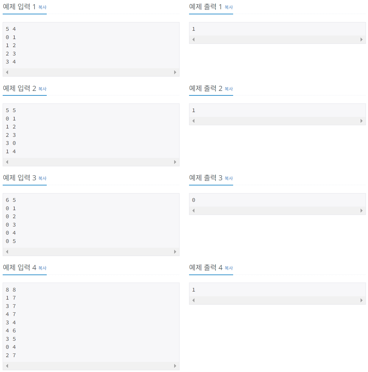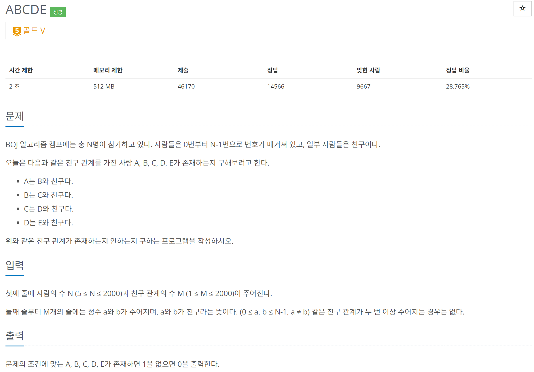 문제에서 요구하는 A, B, C, D, E의 관계는 재귀 함수의 형태와 비슷하기 때문에 주어진 모든 노드에 DFS를 수행하고 재귀의 깊이가 5 이상(5개의 노드가 재귀 형태로 연결)이면 1, 아니면 0을 출력한다.