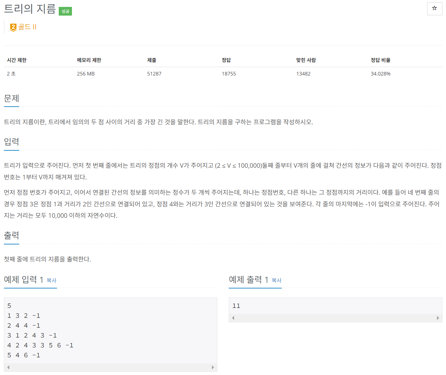 다시 구한 거리 중 가장 큰 값(가장 긴 경로)이 트리의 지름이 된다.