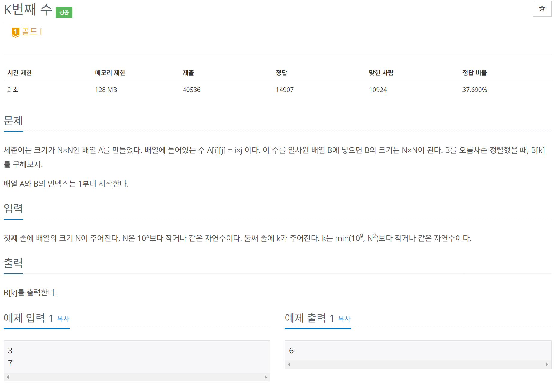 세준이는 크기가 N×N인 배열 A를 만들었다. 배열에 들어있는 수 A[i][j] = i×j 이다. 이 수를 일차원 배열 B에 넣으면 B의 크기는 N×N이 된다. B를 오름차순 정렬했을 때, B[k]를 구해보자. 배열 A와 B
