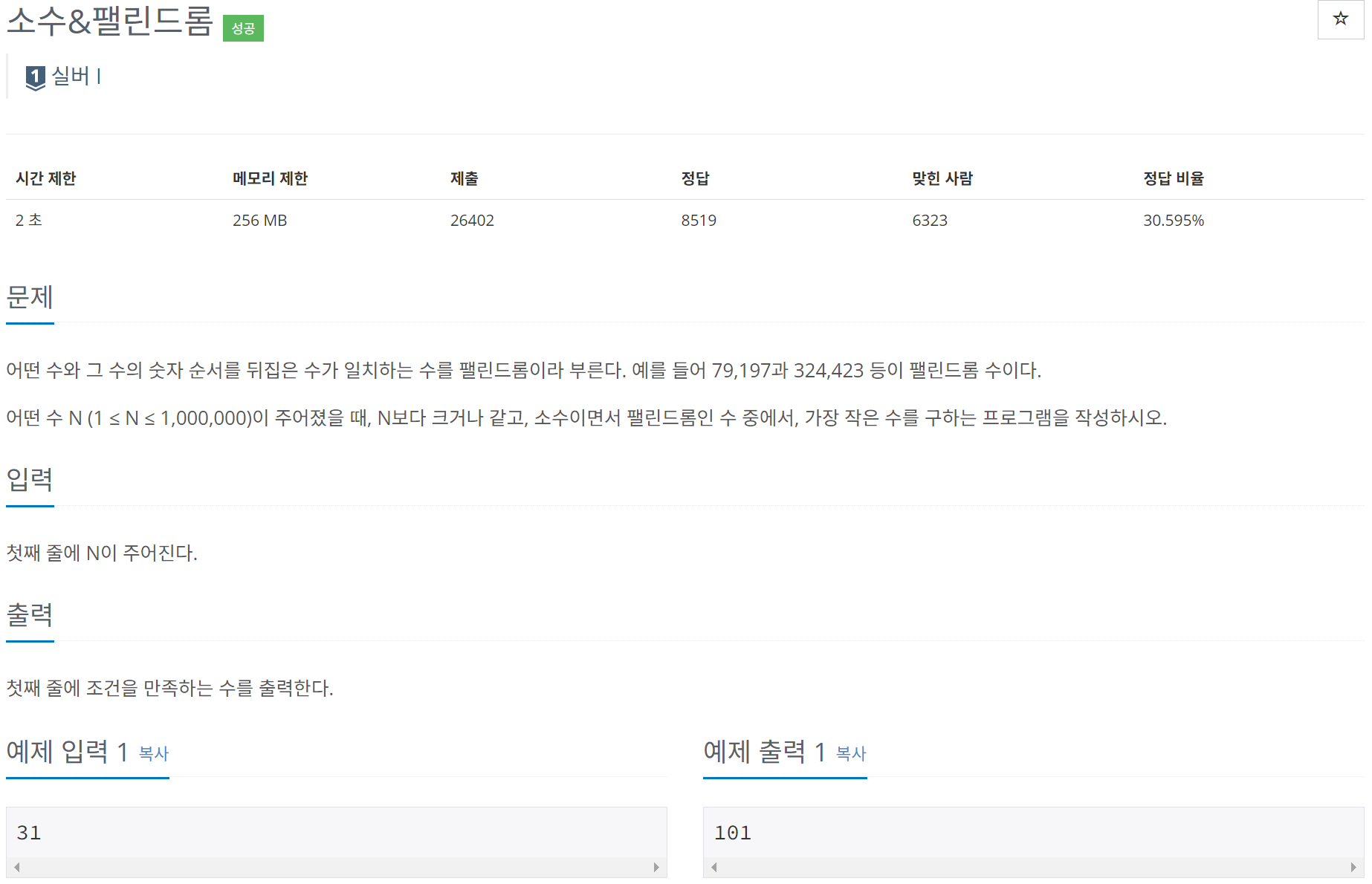 에라토스테네스의 체를 이용하여 최대 범위에 해당하는 소수를 모두 구해 놓고 소수인 수들 중 N보다 크거나 같으면서 팰린드롬 수인 것을 찾아내면 되는 문제이다.