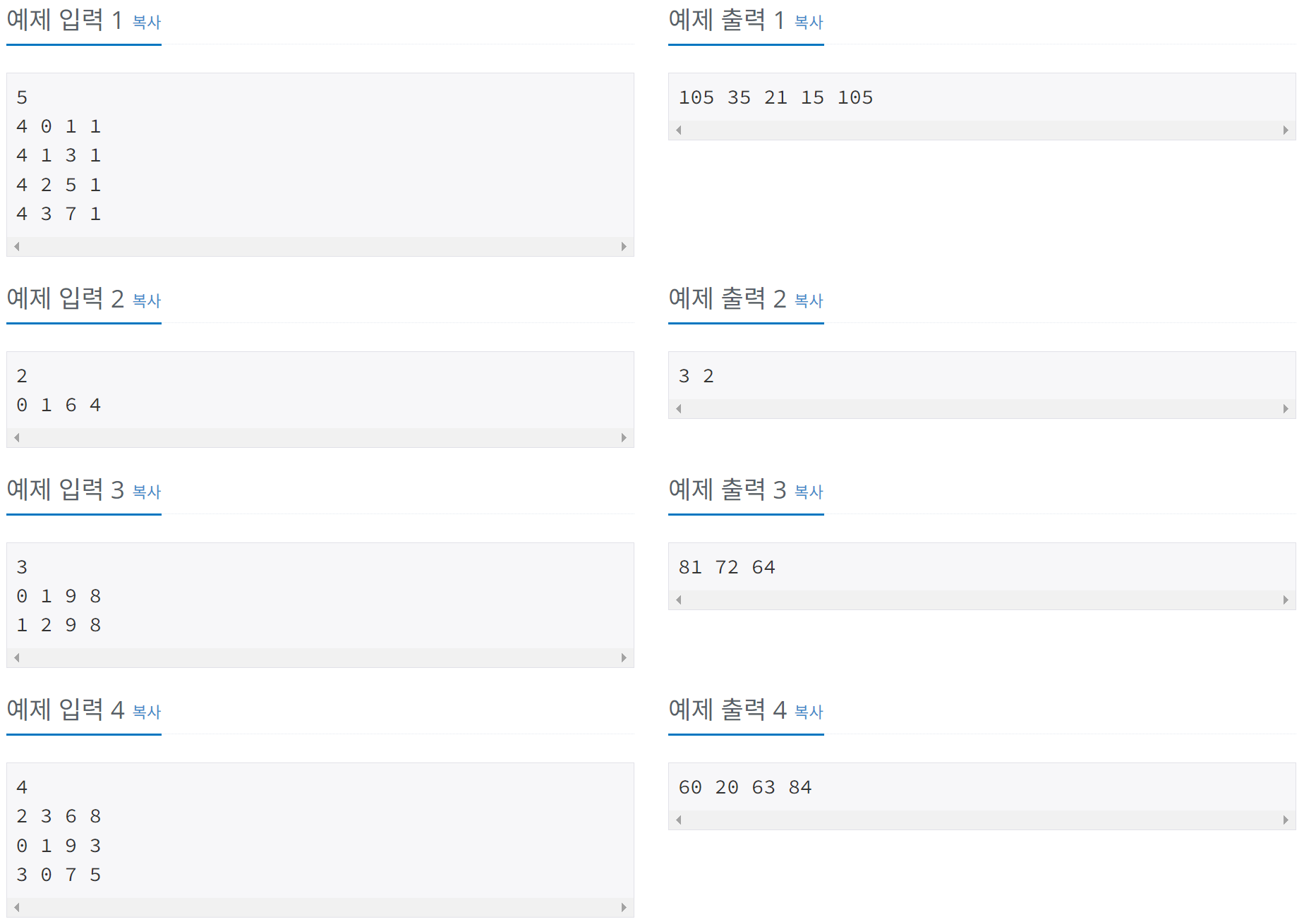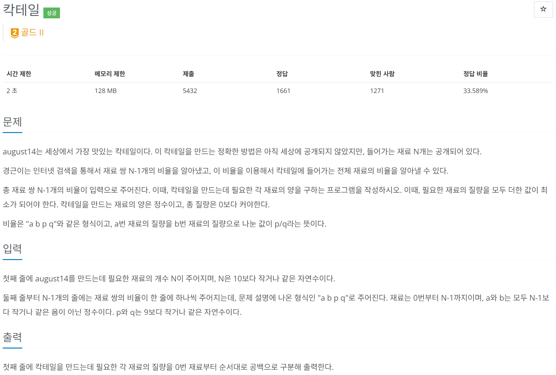 필요한 재료의 질량을 모두 더한 값이 최소가 되어야 하므로 DFS 과정에서 유클리드 호제법을 활용해 비율들의 최소 공배수와 최대 공약수를 구해 정답에 활용한다.