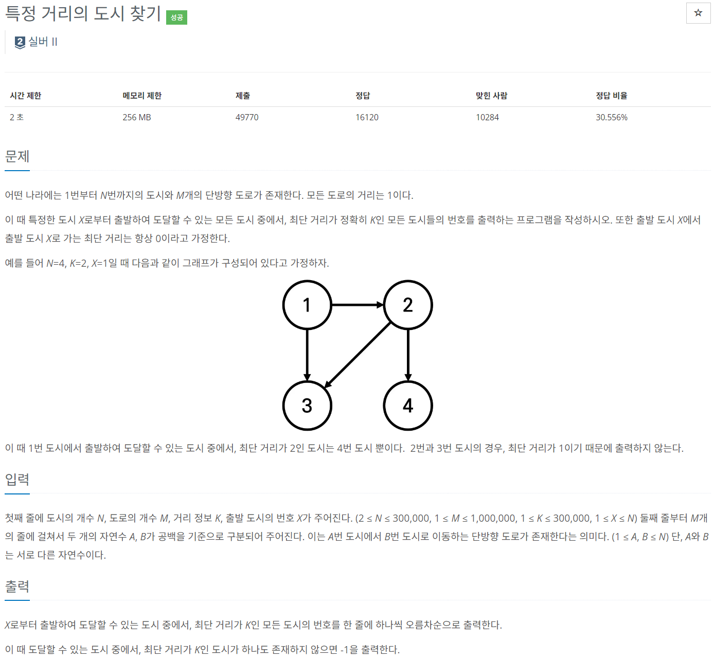 도시의 개수가 최대 300,000개, 도로의 최대 크기가 1,000,000개이므로 BFS 탐색을 활용해 문제를 시간 복잡도 안에서 해결할 수 있다.