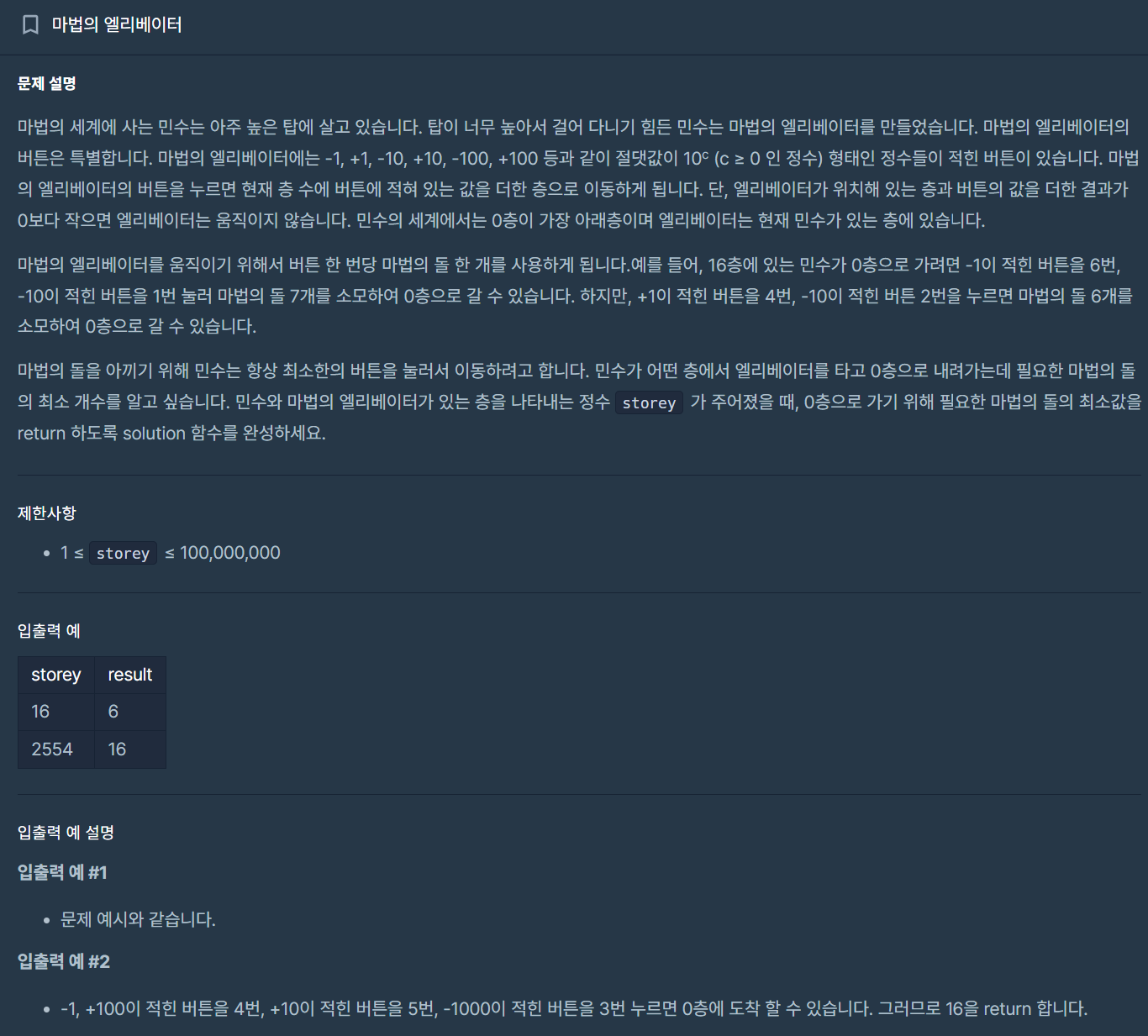 - 우선 입력받은 현재 위치한 층 수를 각 자릿수 별로 구분한다. storey_split = [int(i) for i in str(storey)]