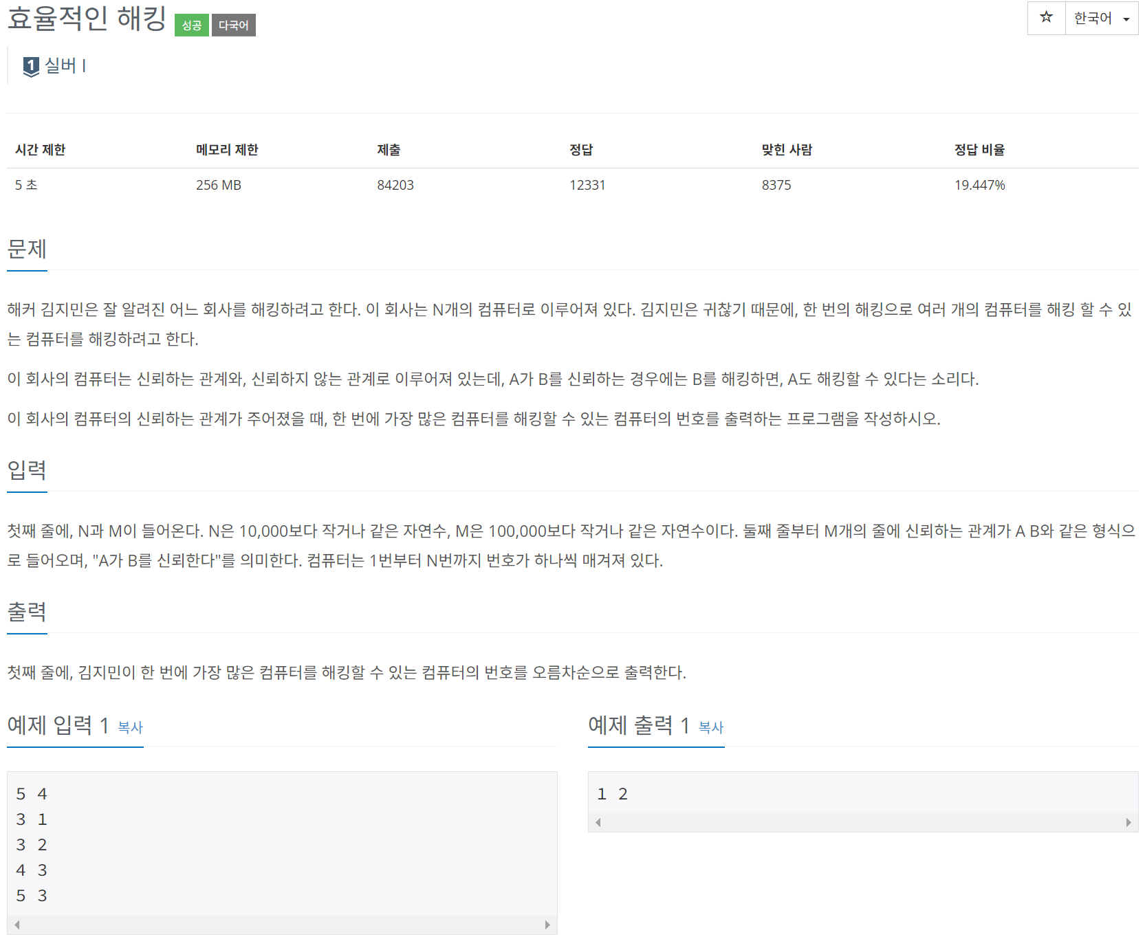 첫째 줄에, N과 M이 들어온다. N은 10,000보다 작거나 같은 자연수, M은 100,000보다 작거나 같은 자연수이다. 둘째 줄부터 M개의 줄에 신뢰하는 관계가 A B와 같은 형식으로 들어오며, "A가 B를 신뢰한
