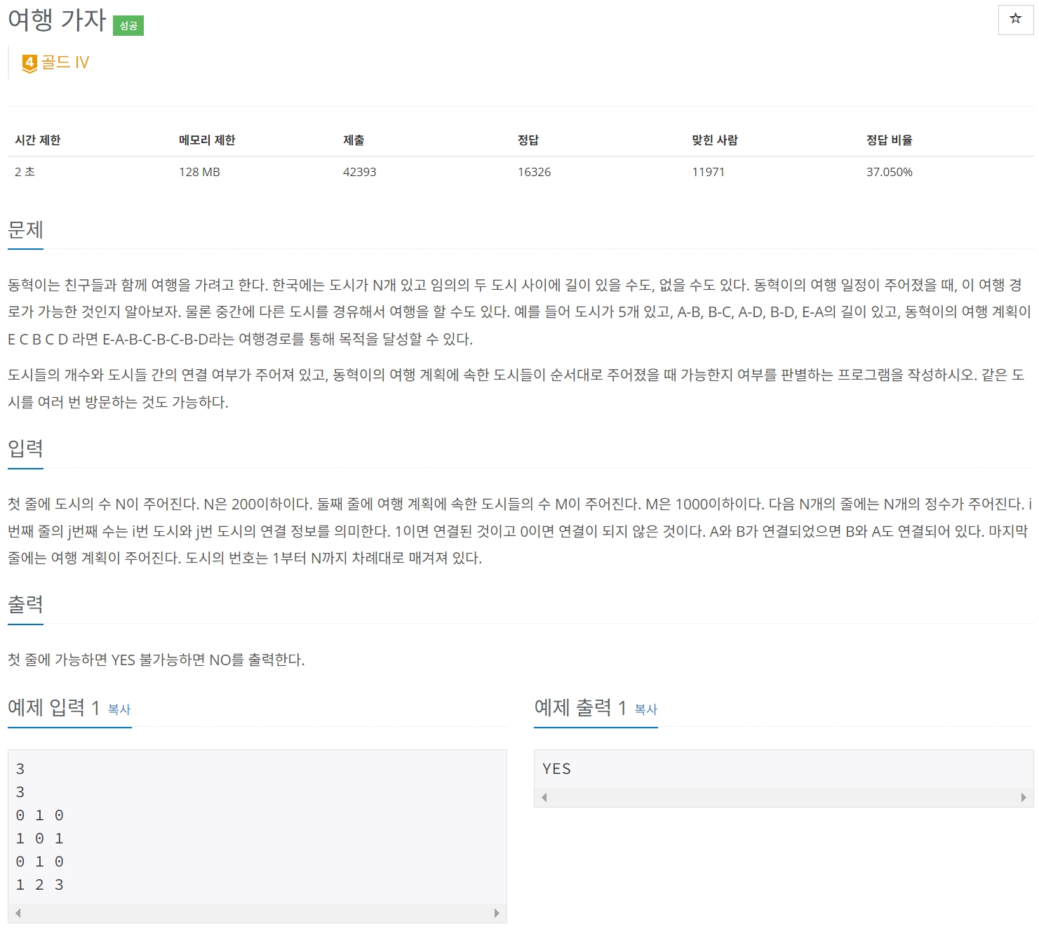 동혁이는 친구들과 함께 여행을 가려고 한다. 한국에는 도시가 N개 있고 임의의 두 도시 사이에 길이 있을 수도, 없을 수도 있다. 동혁이의 여행 일정이 주어졌을 때, 이 여행 경로가 가능한 것인