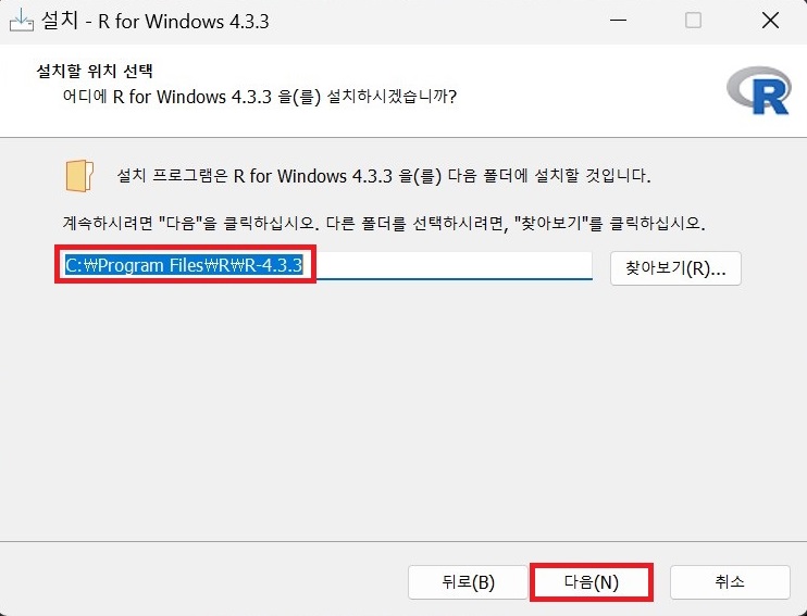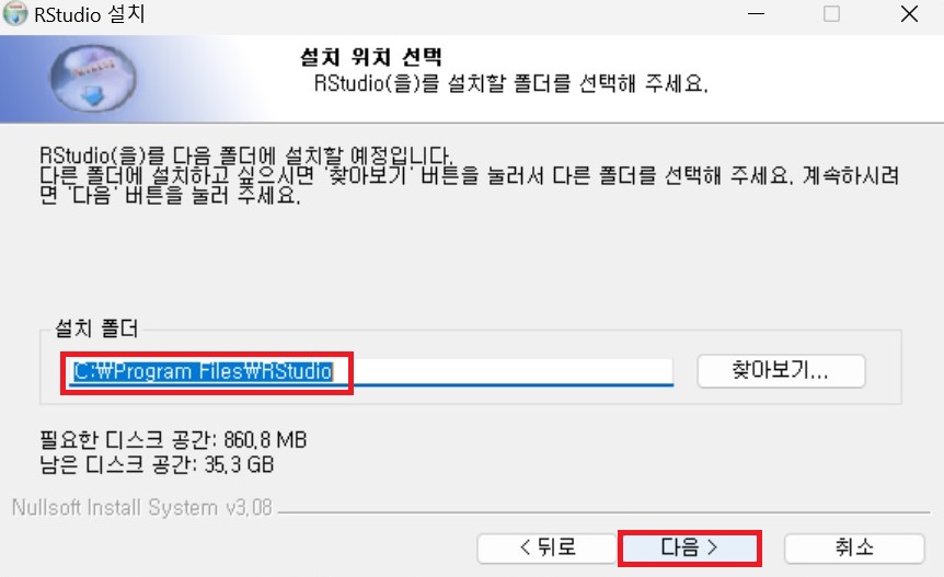 설치할 위치를 선택하여 경로를 변경하거나 유지한 채로 설치를 계속한다.
