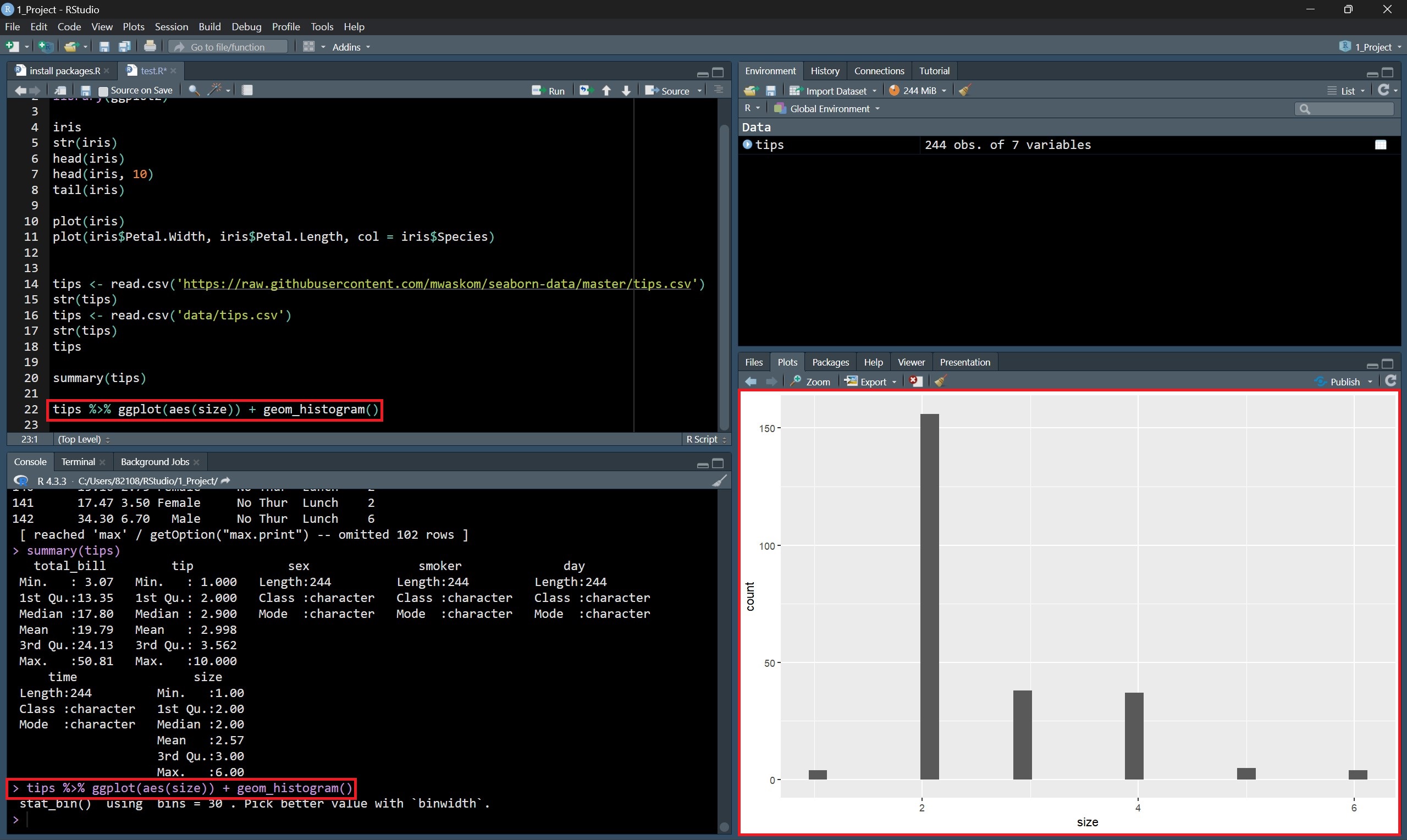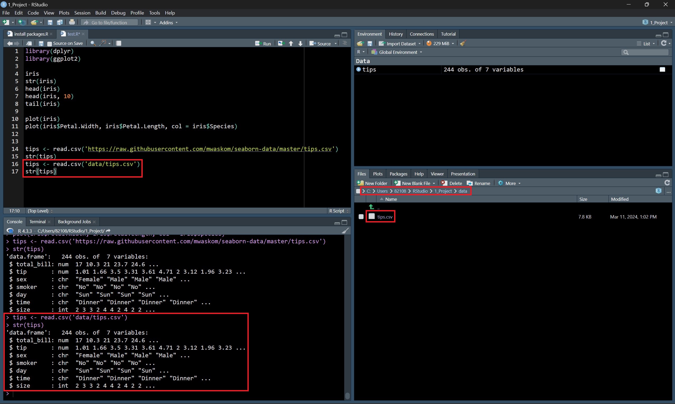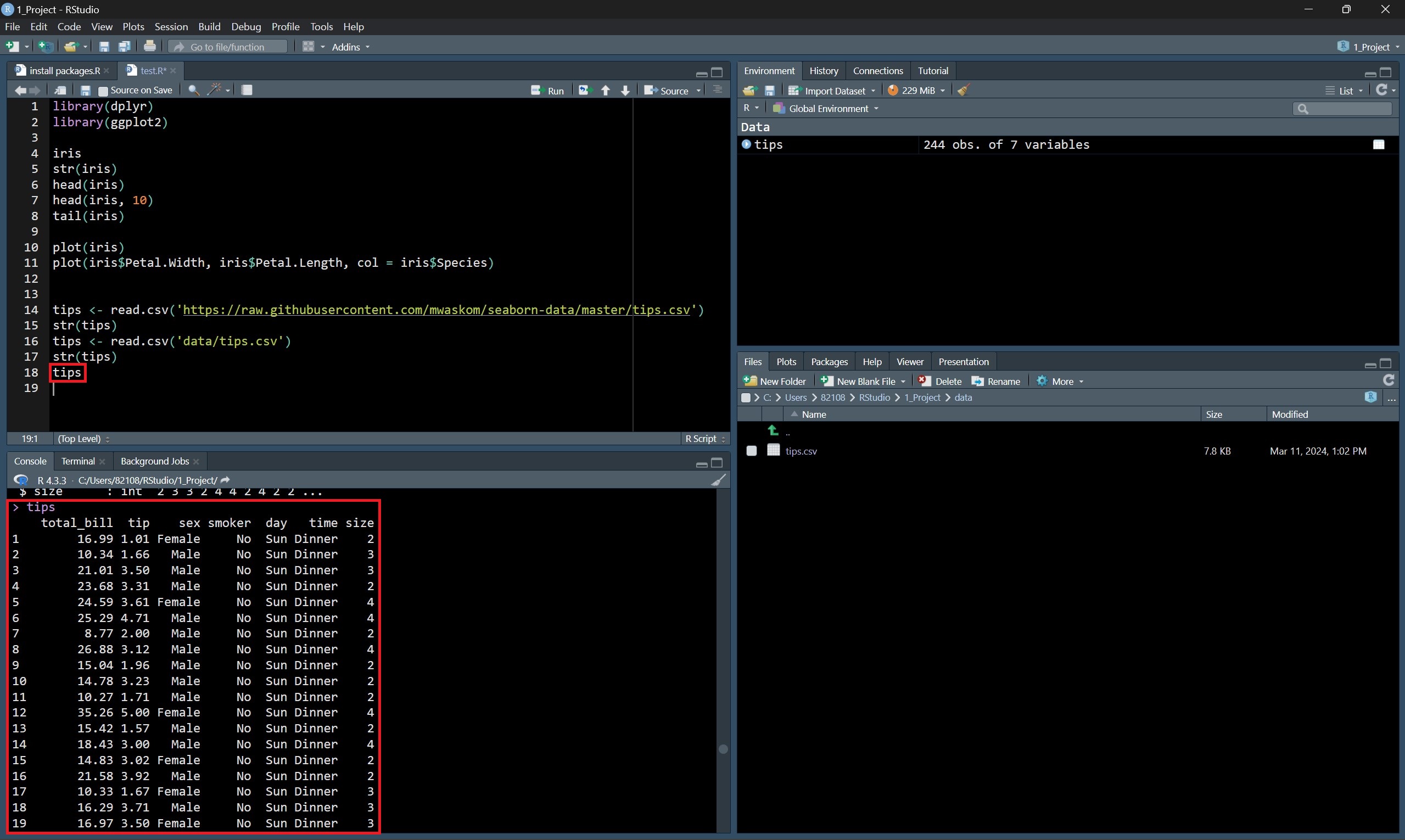 추가로 tips 데이터를 활용해 보면, 해당 데이터는 csv 파일의 형태로 저장되어 있기 때문에 read.csv() 함수로 해당 파일을 불러와야 한다.