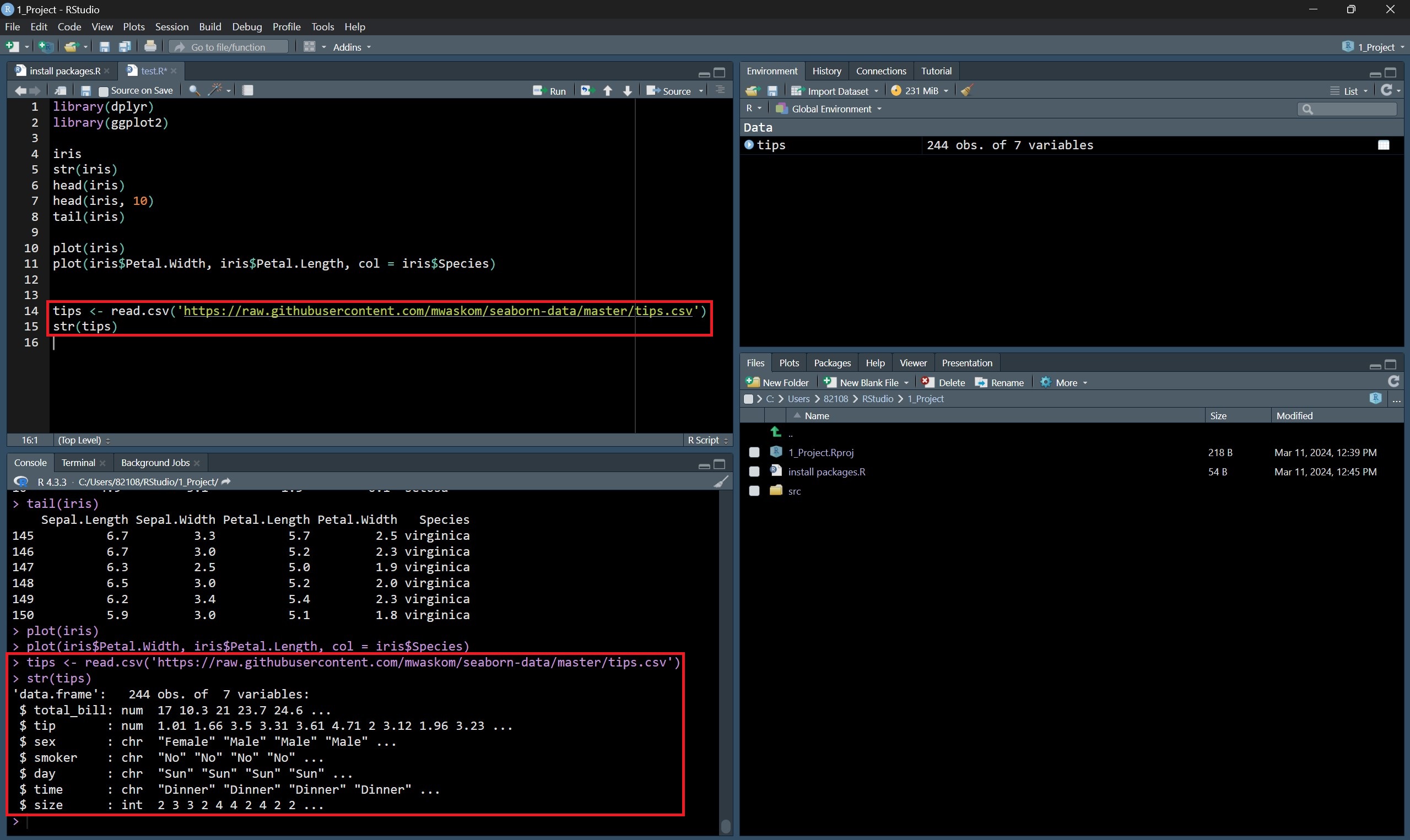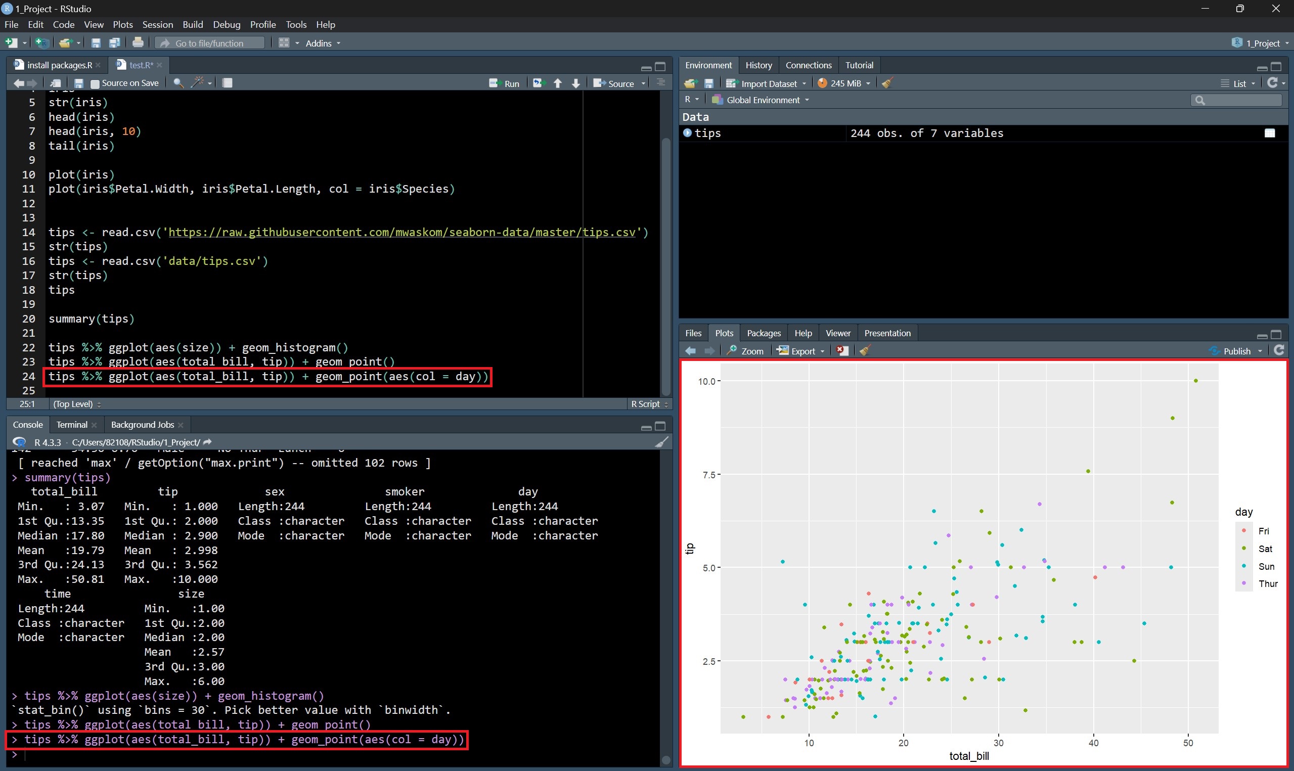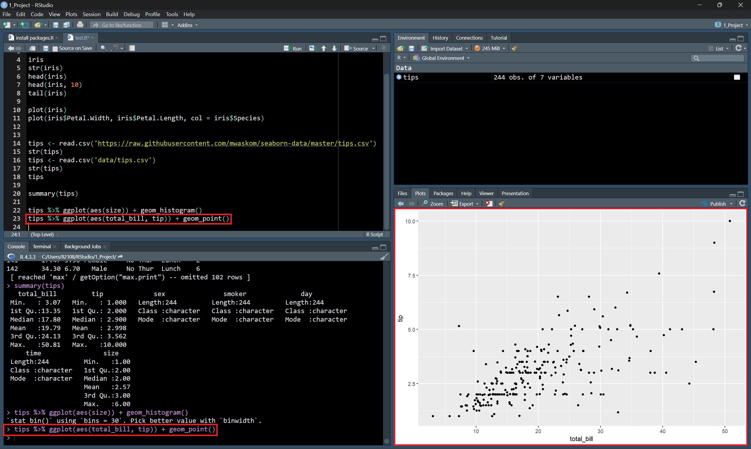 추가로 tips 데이터를 활용해 보면, 해당 데이터는 csv 파일의 형태로 저장되어 있기 때문에 read.csv() 함수로 해당 파일을 불러와야 한다.