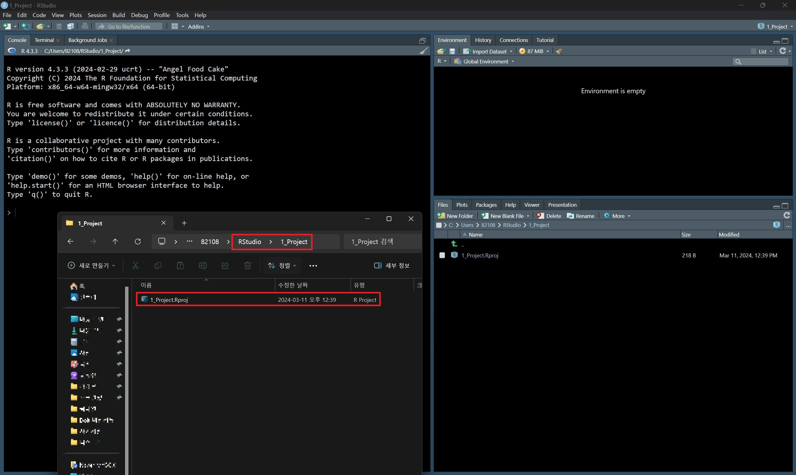 그렇게 디렉터리를 생성하고 나면 지정해 준 경로 안에 .Rproj의 확장자와 지정해 준 이름을 가지는 R Project가 생성된 것을 확인할 수 있다.