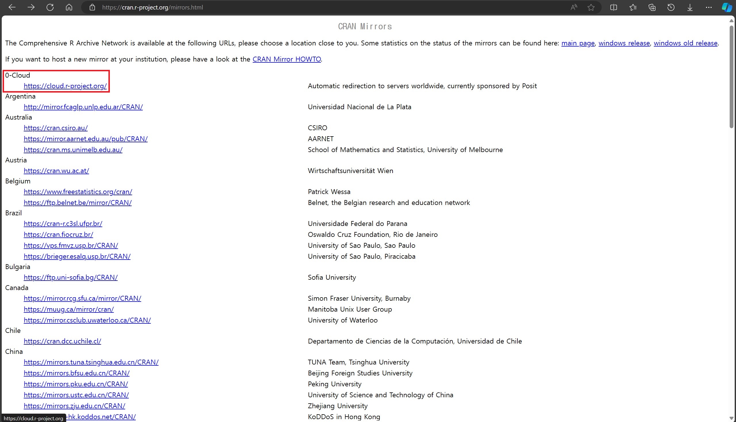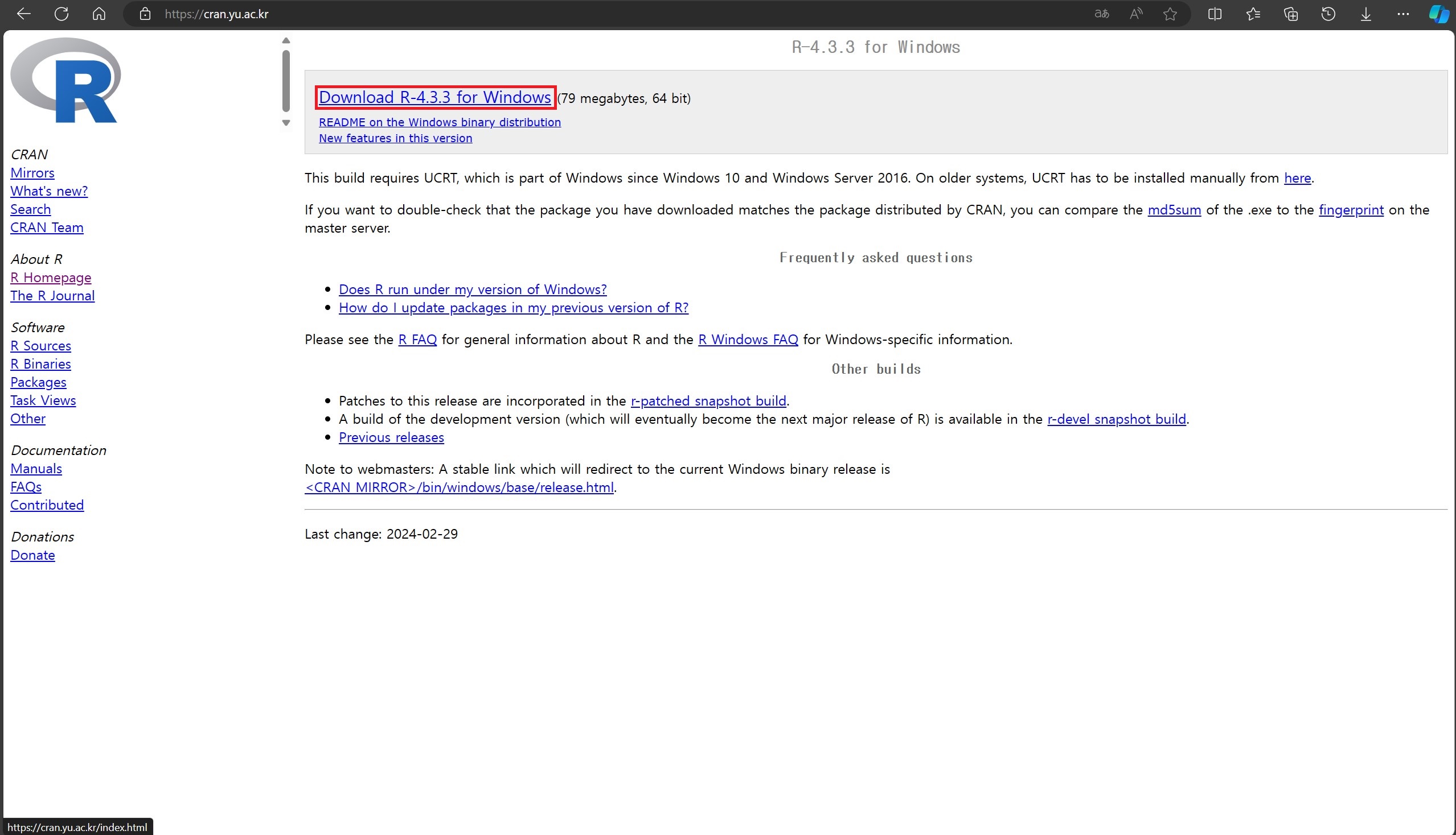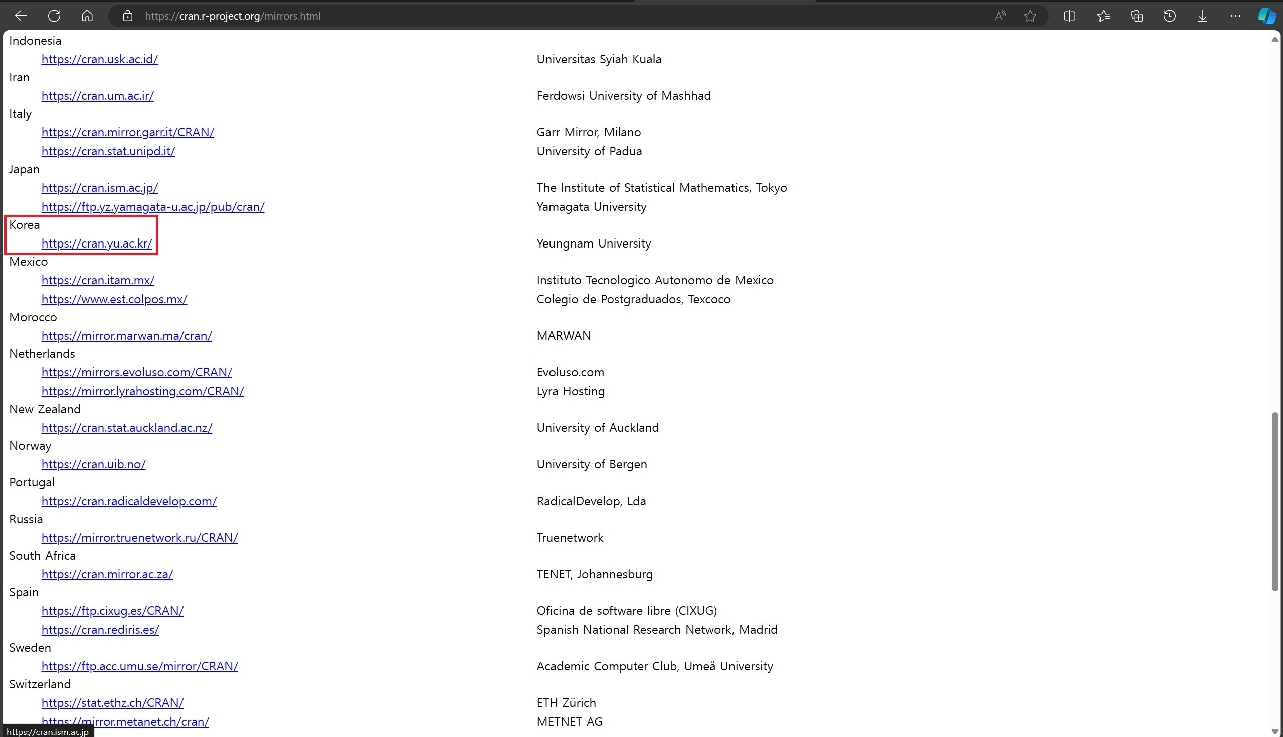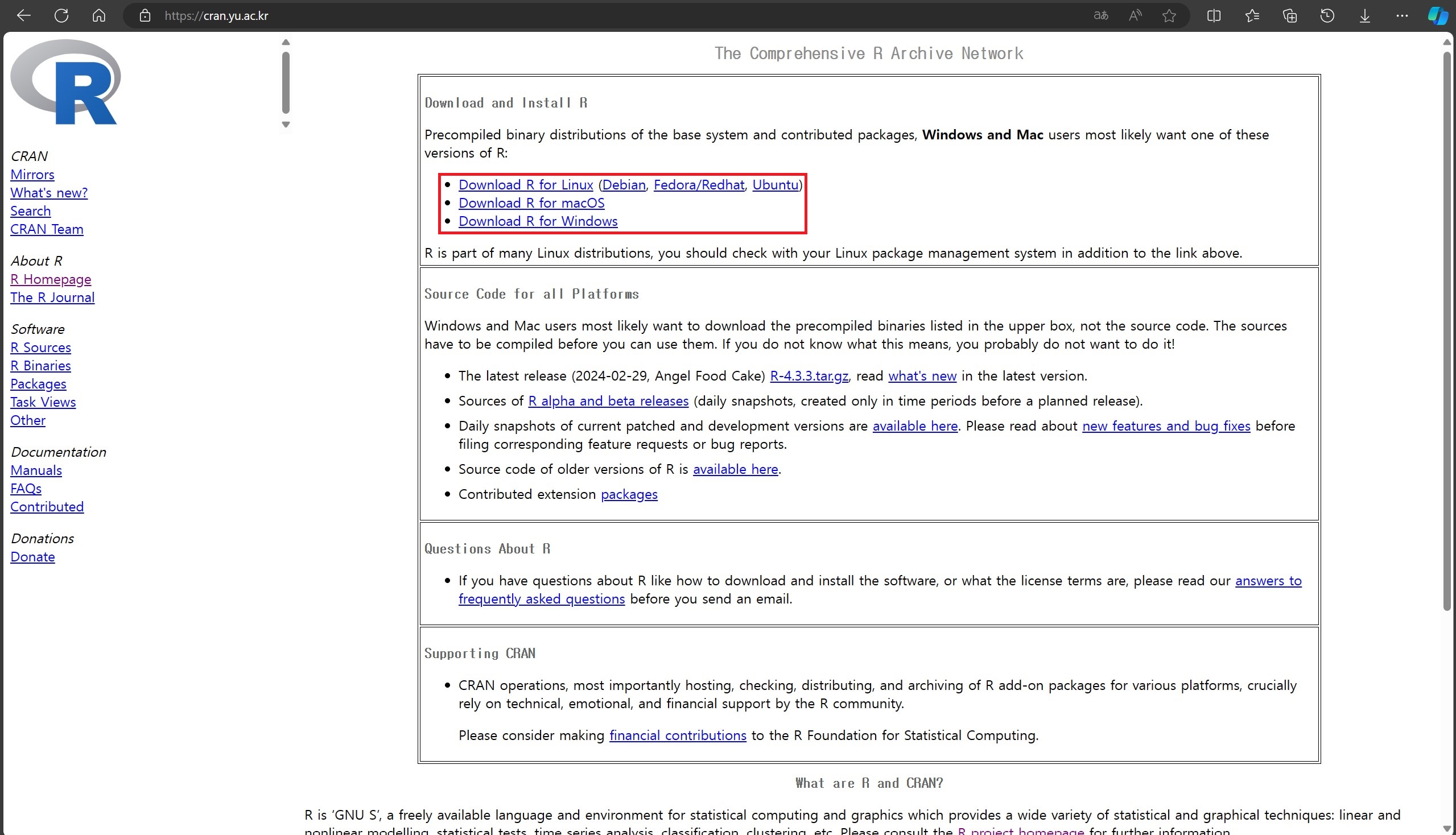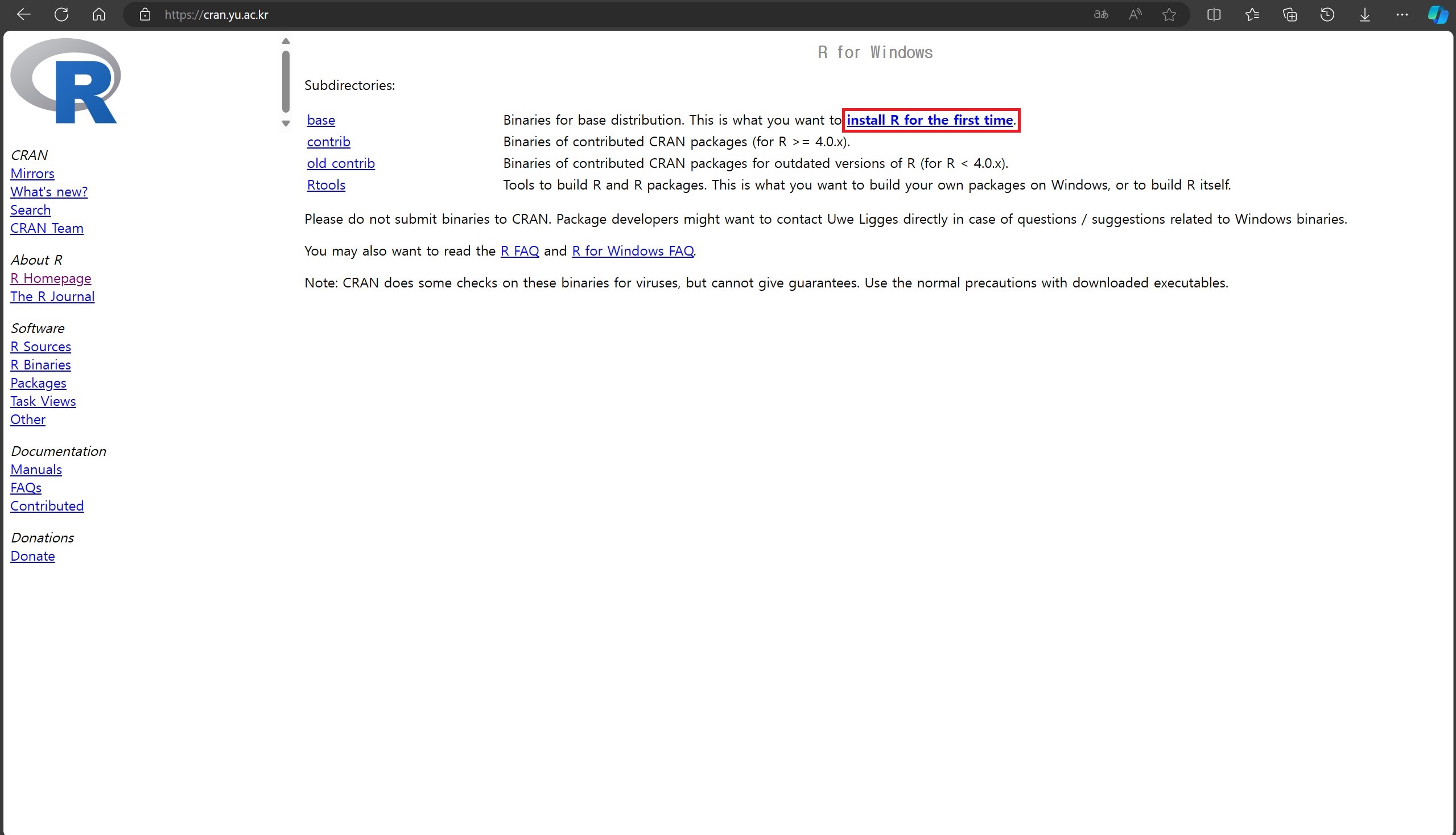 먼저 R을 설치해 보면, 위의 링크를 접속하여 사진과 같이 따라 하면서 설치하면 된다.