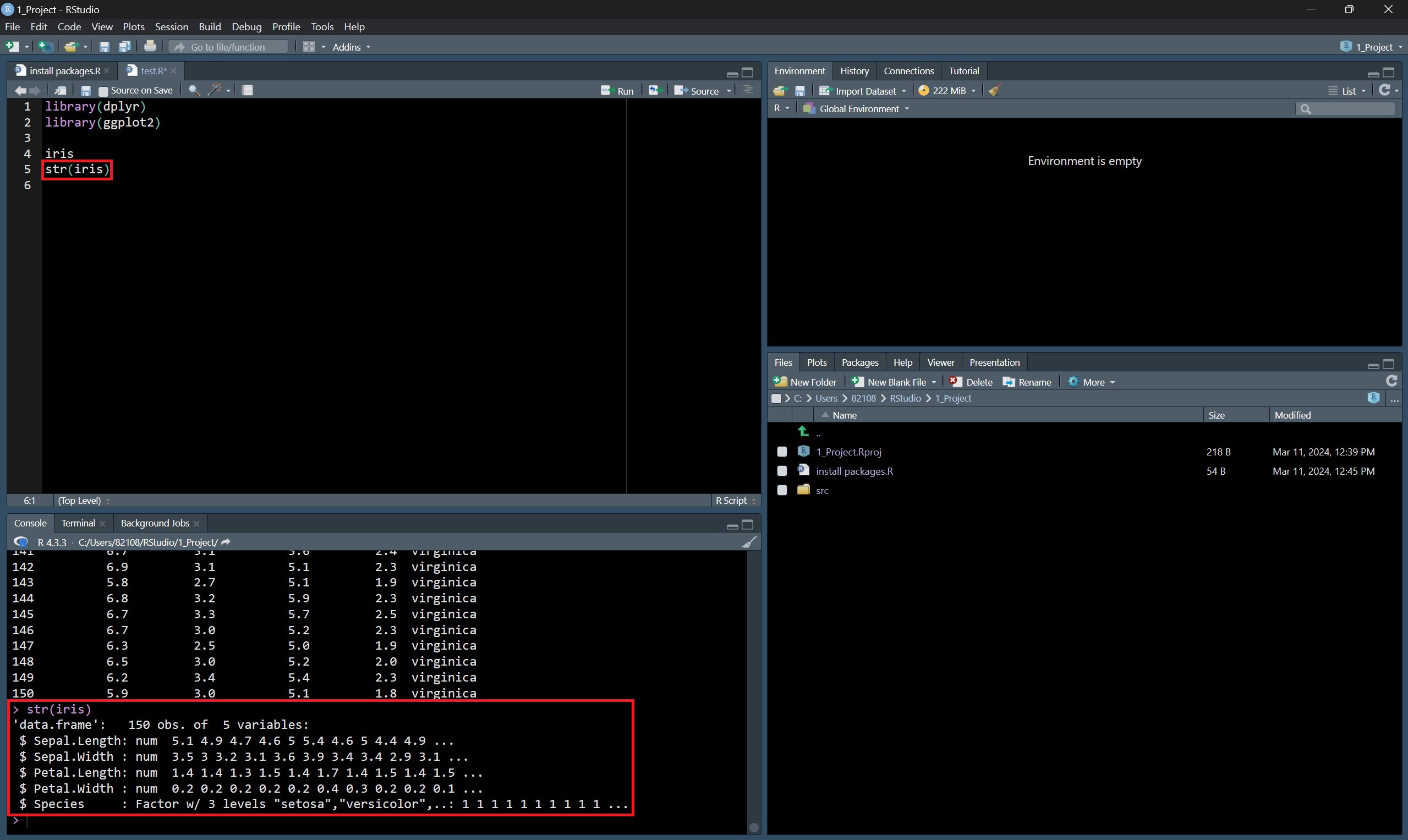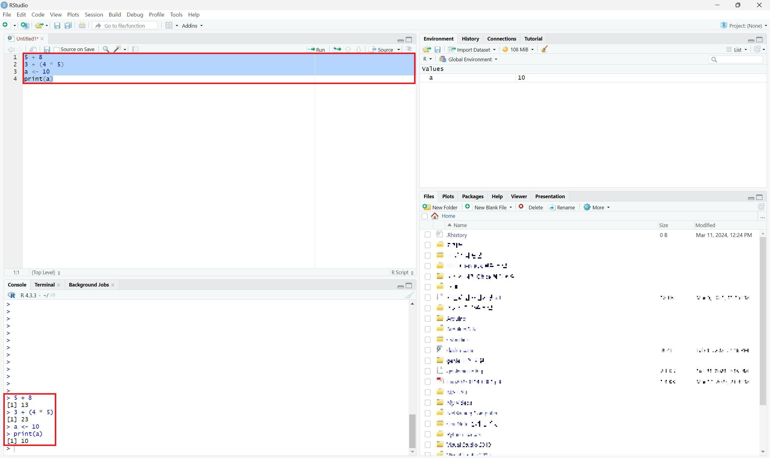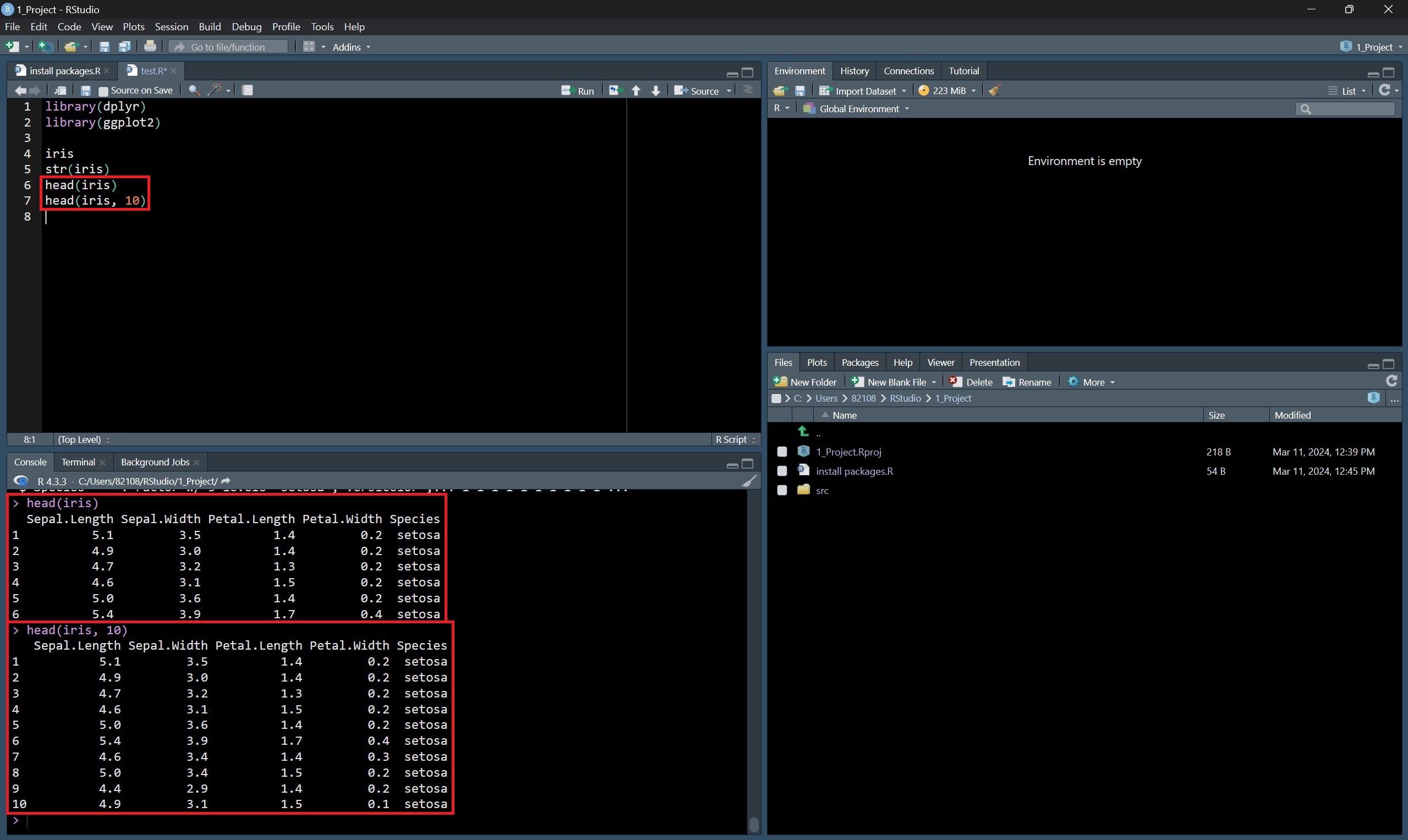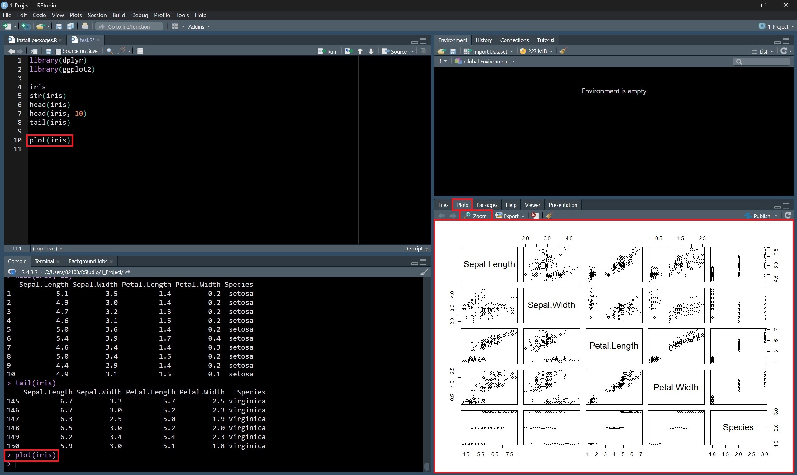 드래그한 R 명령문만 실행이 되므로 실행을 원하는 부분만 드래그하면 된다.