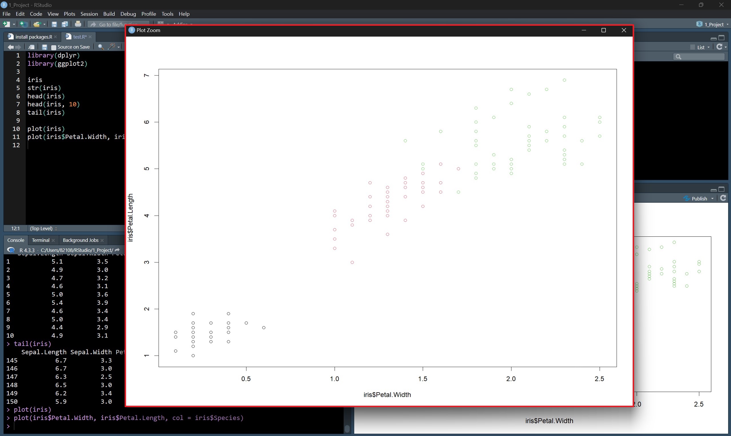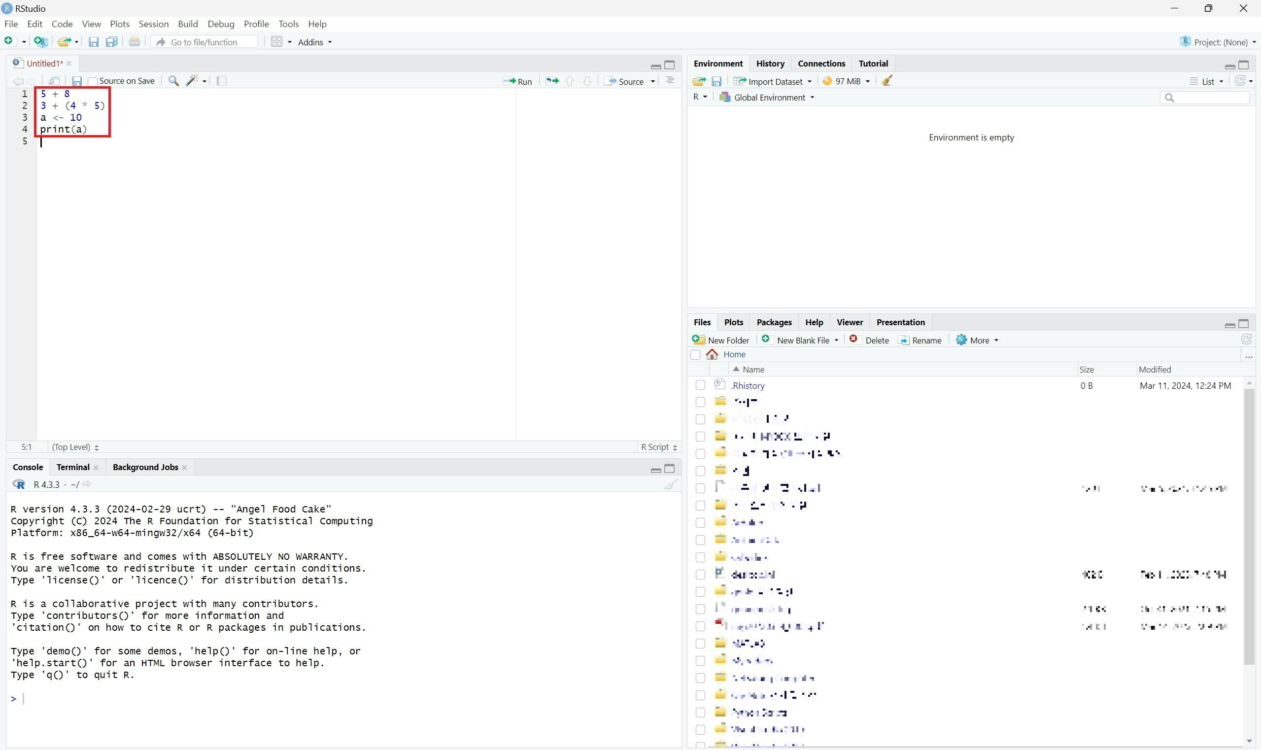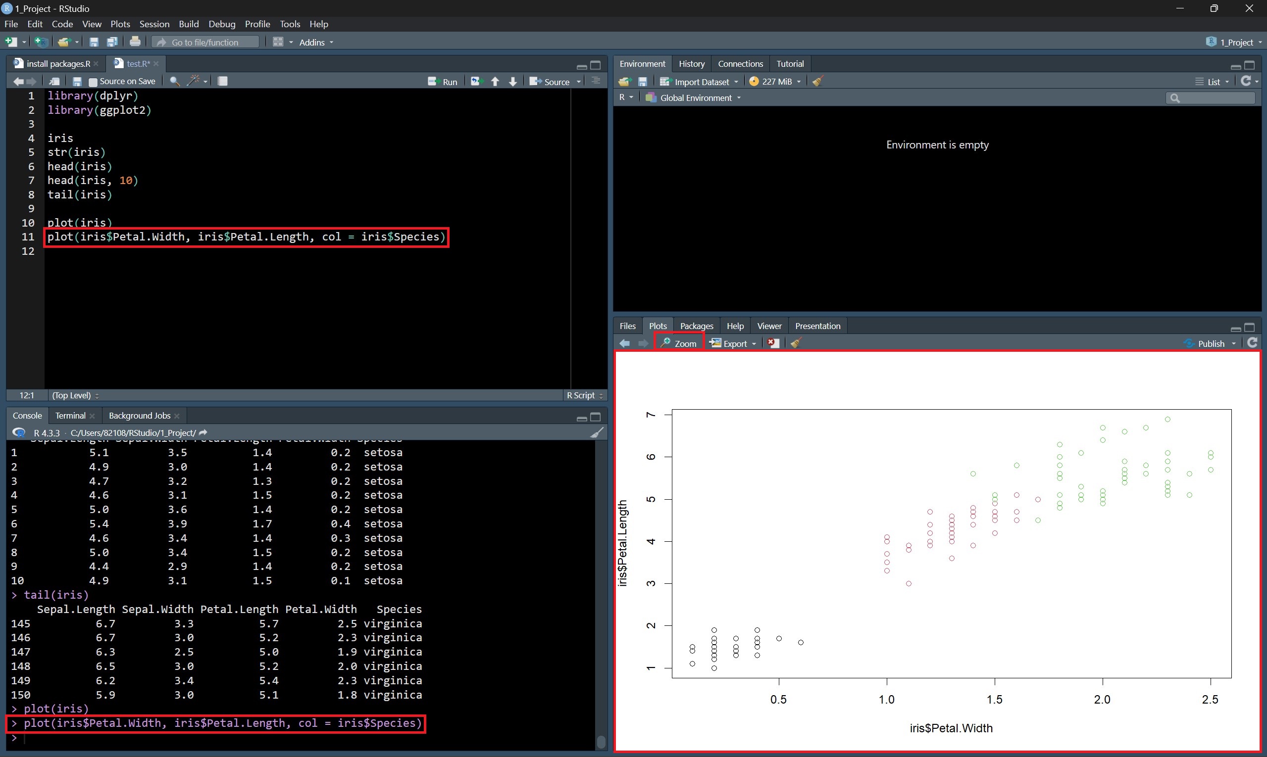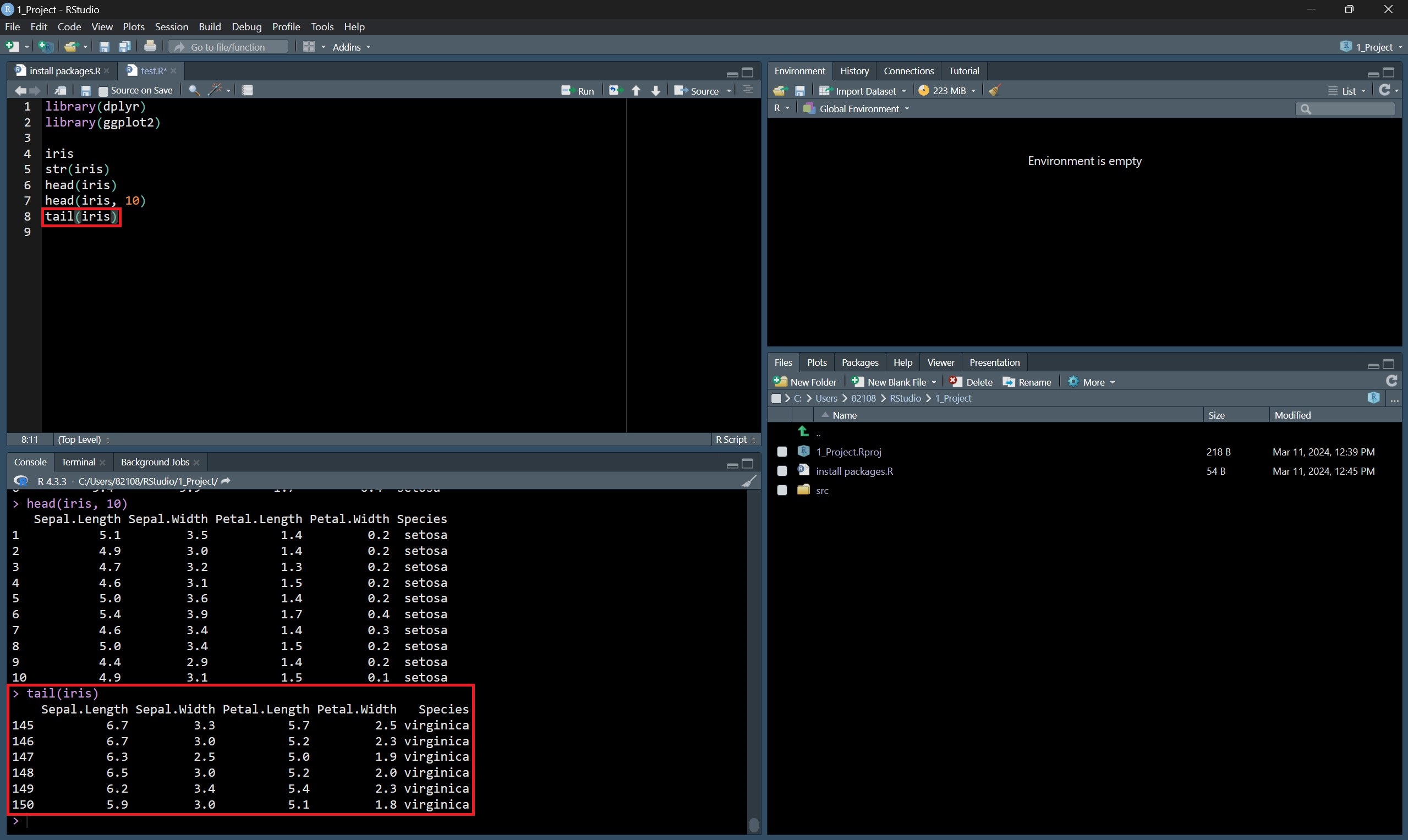 드래그한 R 명령문만 실행이 되므로 실행을 원하는 부분만 드래그하면 된다.